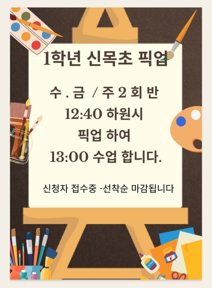 안녕하세요 하늘바람창작소 미술학원입니다 3월 초등 1학년 초등학교 입학을 앞 두고 초등학교 픽업 후 수업 문의가 많아서 공지 올려드립니다 신목초 수요일 .금요일 12시 40분 픽업 13시 수업 / 주2회 이번 주 부터 신청을 받고 있으며 선착순 마감됩니다. 초등 1학년은 정규수업 후 자체 제작한 인물 교재로 수업을 진행하고 있습니다. <img src="https://blogthumb.pstatic.net/MjAyNjAxMTVfODUg/MDAxNzY4NDgzNTM5NTQ4.4IVMDbcHP67kgdH-js5BSWU6SyJPqDjMiKiGh_MtucMg.n7LQshJNLD1LUau7HreD10hwoOTbczshkKHsFyq3c44g.JPEG/900%A3%DFScreenshot%A3%DF20260115%A3%DF221218%A3%DFDrive.jpg?type=s3" />