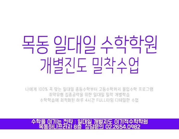 목동 일대일 수학학원 고등부 & 중등부 실전에 강한 개별진도 수학학원 전략부터다르다 ! 수학을 이기는 전략 : 이기적수학학원 학년이 올라갈수록 수학 공부할시간은 부족하기 마련이죠. 수학플랜을 첫 시작으로 학생 개개인의 수학실력 및 이해도, 취약점 모두 다르기에 목동 일대일 개별진도 수업 수학을 이기는 전략 이기적 수학학원을 추천합니다. 일대다수의 칠판식 수업으로 학원에서 시간만 때우고가는 수업이 아닙니다. 학원에 온것만으로 다가 아닙니다. 하루 오직 한반을 위한 한반중심 집중수업, 일대일 과외식 수업으로 한명에게 집중 개인에게 맞는 교재 선택부터 수학 형행과 선행진도 선택 및 오답노트관리까지 하루 4시간 담....... <img src="https://blogthumb.pstatic.net/MjAyNjAxMjhfMTc1/MDAxNzY5NTY0OTQ4NjQ2._NFcq35CrdCLEmI7SYSyvPiRP_IHo9KtjfaTjQxlJywg.uIykHDH34tYC1aRecIRUBWyWKH4Gem9zVZXE-VEYsrUg.JPEG/IMG%A3%DF6352.JPG?type=s3" />