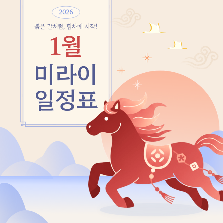 미라이 어학원 입니다 :) 이제 곧 2025년 푸른 뱀의 해가 끝나고 2026년 붉은 말의 해가 시작되네요! 불의 기운을 상징하는 해인 만큼 진취적으로 새로운 일에 도전하기 걸맞은 해입니다 ^o^ 우선 1월 시간표 안내드립니다 :) 1월에는 드디어 JLPT 전・후로 문의가 가장 많았던 기초문법 클래스가 "大개강" 됩니다! [매일반・플러스・라이트] 모두 처음부터 시작되니 2026년 새로운 목표로 일본어를 계획중이신 분들은 부디 이번 기회에 도전해 보세요 ! https://blog.naver.com/miraijapanese/224101598276 자세한 사항은 윗 포스트를 통해 확인 부탁드립니다 :> 1월 금요일 수업은 - 월,수반 : 2일,16일 - 화,목반 : 9일,23일 입....... <img src="https://blogthumb.pstatic.net/MjAyNTEyMjdfMzIg/MDAxNzY2NzYzODE0MzE5.JmsDUctbJJ5tJVlBUddZM-3fOE3cyKNeOQC4F0EyPLcg.BwUJaa1oxBsvHRNH-JHpb20NVp659Iu7WsYJ9e7rt28g.PNG/2.png?type=s3" />