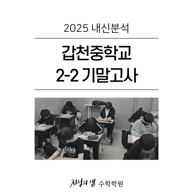 안녕하세요. 지성의샘 수학학원 월평점입니다. 흔히 말하는 '중2 도형'인 닮음에서 지난 번에 비해 문제가 쉽게 출제 되었습니다. 혹, 시험 난이도가 낮아진 것이 아닌가 하는 말씀을 하십니다. 하지만 닮음 단원에서 문제 수는 적지만 어려운 문제가 출제 되었고, 확률 단원에서는 절대적으로 많은 시간을 요구하는 문제가 다수 출제 되었습니다. 시간관리가 되지 않아 시험이 쉬워 보였지만 실상은 그렇지 않다는 말씀드립니다. 관련해서 갑천중학교 2025년 2학년 2학기 기말고사를 분석해보려고 합니다. 출제 요약 출제 범위 : 도형의 닮음 ~ 확률 문제 유형 : 객관식 26문항, 주관식 0문항 닮음에서 예상보다 어려운 문제가 많이 출....... <img src="https://blogthumb.pstatic.net/MjAyNjAxMDdfMjI1/MDAxNzY3NzYyNDk5MTY5.l5FgQB86kyg5dfCW2brcEgW_9SvJNq0nAsqwJFBQMTYg.ovvXIXHn7NdfhWnNVBtjLWQUWSHq0B5voNqGRFrFLIkg.PNG/%C1%A6%B8%F1%C0%BB-%C0%D4%B7%C2%C7%D8%C1%D6%BC%BC%BF%E4_-003.png?type=s3" />