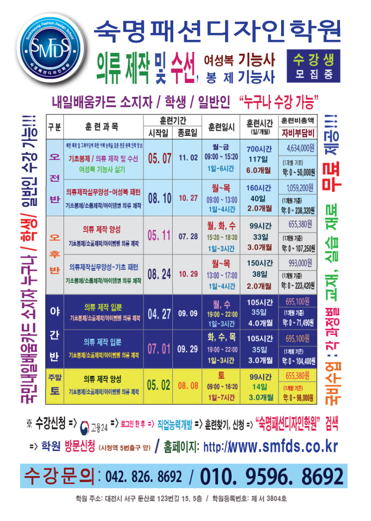 #국비과정 #시간표 # 야간반 #주말반 #주간반 #숙명패션디자인학원 #의류제작 #대전패션학원