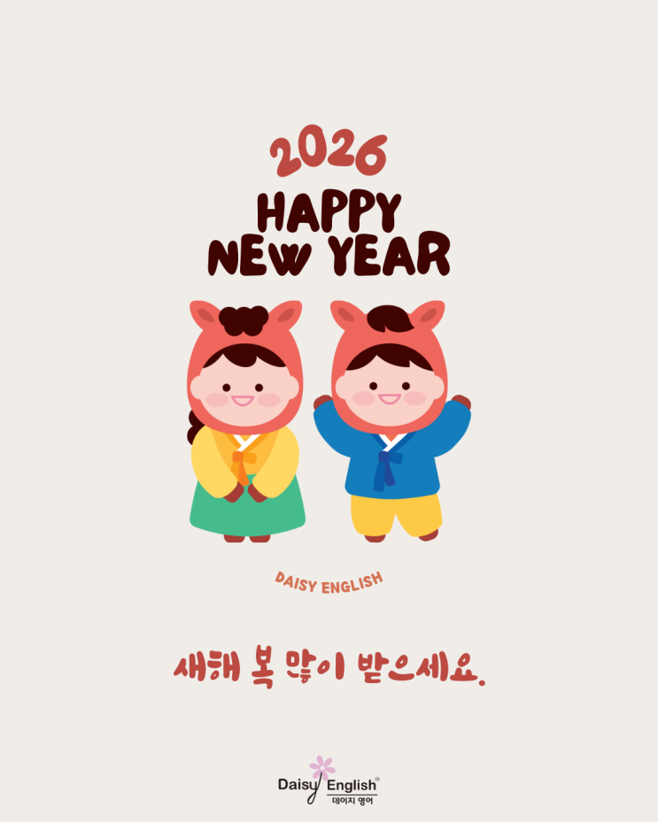 2026년 새해 인사드립니다 2026년 새해가 밝았습니다. 지난 한 해 동안 데이지영어를 믿고 함께해 주신 모든 분들께 진심으로 감사드립니다. 아이들을 가르치는 일은 늘 ‘마음’이 먼저입니다. 한 명 한 명의 성장 속도를 존중하고, 작은 변화도 놓치지 않으려는 마음. 그 마음이 쌓여 아이들의 자신감이 되고, 결국 실력으로 이어진다는 걸 현장에서 매일 확인했습니다. 새해도 교육 현장과 운영 환경이 쉽지만은 않겠지만, 그럴수록 더 기본에 집중하고, 더 제대로 가르치고, 더 꾸준히 가겠습니다. 데이지영어는 2026년에도 아이들이 영어를 “외우는 공부”가 아니라 “할 수 있는 언어”로 만나도록, 수업과 커리큘럼, 그리고 운영 시스템....... <img src="https://blogthumb.pstatic.net/MjAyNjAxMDJfODIg/MDAxNzY3MzM3NjY5NTY4.DpOcvxImx5y-r-aAE0yad0IthHVHOl_WgIvS-UwrQnIg.bBJuFLJmcq_JyZIRaDI85DIRyxTf0Yx-lHid_LQjpz0g.PNG/%B9%E0%C0%BA_%BB%A1%B0%A3%BB%F6_%B1%CD%BF%A9%BF%EE_2026%B3%E2_%BB%F5%C7%D8_%C0%CE%BB%E7_%C0%CE%BD%BA%C5%B8%B1%D7%B7%A5_%B0%D4%BD%C3%B9%B0.png?type=s3" />