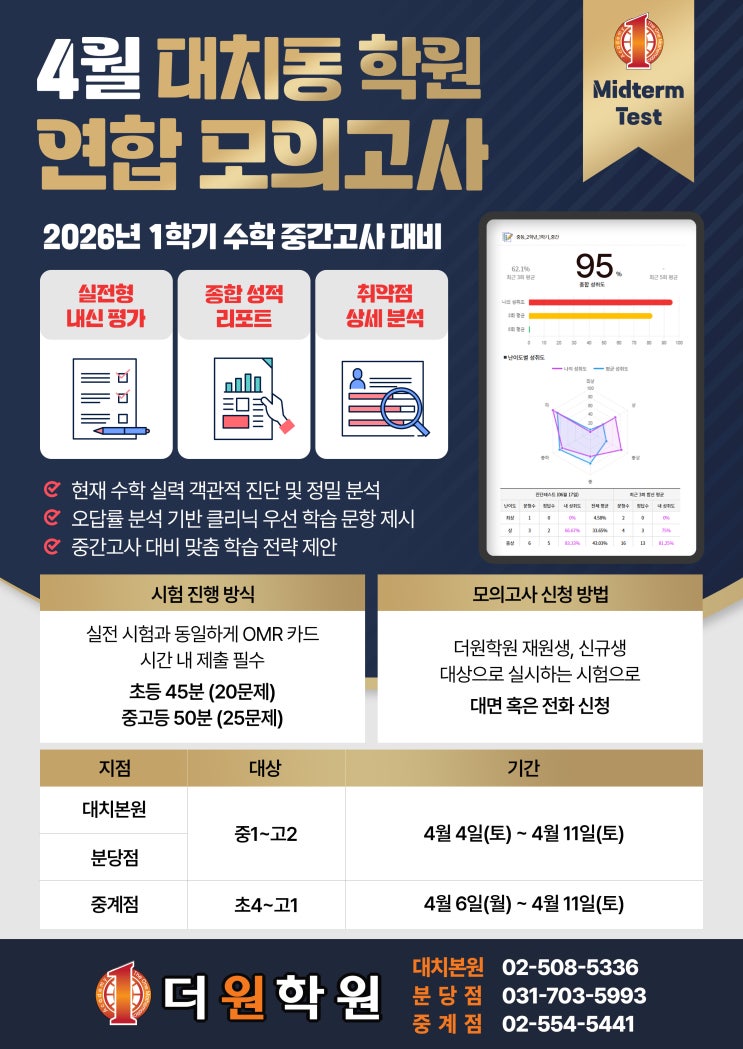 안녕하세요, 더원학원입니다 다가오는 1학기 중간고사를 대비해 4월 대치동 학원 연합 모의고사를 실시합니다. 단순한 문제풀이를 넘어, 내 실력을 정확하게 파악하고 성적 향상의 방향을 잡을 수 있는 기회입니다. ■ 시험 일정 : 4월 4일(토) ~ 4월 11일(토) ■ 시험 대상 : 중학교 1학년 ~ 고등학교 2학년 ***왜 이 모의고사를 봐야 할까요?*** ✔ 실전형 내신 평가 → 실제 학교 시험과 동일한 방식으로 진행되어 실전 감각을 키울 수 있습니다. ✔ 종합 성적 리포트 제공 → 시험 후 개인별 성적 분석 리포트를 통해 현재 위치를 객관적으로 확인! ✔ 취약점 상세 분석 → 오답 분석을 기반으로 부족한 개념과 유형을 정확히 짚어드립니다. ....... <img src="https://blogthumb.pstatic.net/MjAyNjAzMjBfMjky/MDAxNzczOTk2Mjc2Mzkw.UFzzbrPShqsaKMcKm6az2C1KaUqpUIiT0YVLgf7g6uAg.7lNmZZIFrjzst_6OOHzzFfZ1_L67E5eDGkBQYpbnlgEg.JPEG/26-1_%C1%DF%B0%A3_%B4%F5%BF%F8%C7%D0%BF%F8_%B4%EB%C4%A1_%BF%AC%C7%D5%B8%F0%C0%C7%B0%ED%BB%E7_202603_%C0%A5%BF%EB.jpg?type=s3" />