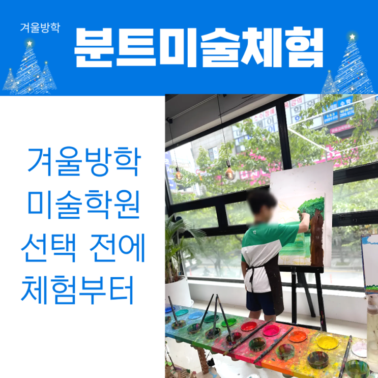 겨울방학, 미술학원 선택 전에 꼭 필요한 시간 분트미술 체험수업 안내 겨울방학이 되면 많은 부모님들이 미술학원을 고민하게 됩니다. “지금 시작해도 괜찮을까?”, “우리 아이에게 이 수업 방식이 맞을까?” 이런 질문들이 자연스럽게 따라오죠. 분트미술의 겨울방학 체험수업은 바로 이런 고민을 등록 전에 먼저 확인해볼 수 있도록 준비된 수업입니다. Q: 분트미술 체험수업은 어떤 수업인가요? 분트미술의 체험수업은 아이를 잘 그리게 만들기 위한 수업이 아닙니다. 미술 활동 안에서 드러나는 아이의 성향, 태도, 표현 과정을 천천히 살펴보는 시간에 가깝습니다. 결과보다 아이가 어떻게 시작하고, 어떤 선택을 하고, 어려움 앞에서 어....... <img src="https://blogthumb.pstatic.net/MjAyNTEyMjlfMjM0/MDAxNzY2OTcxOTc1Nzcw.Z8xBc1dKtEnFJtfJA0kLhGj8iWSRd8YrEMhJN3DQ1_8g.cqW5fR9a6y1stgaUnkDB8LCPns4na75IiXaCJ5-HXhUg.PNG/IMG%A3%DF9096.PNG?type=s3" />