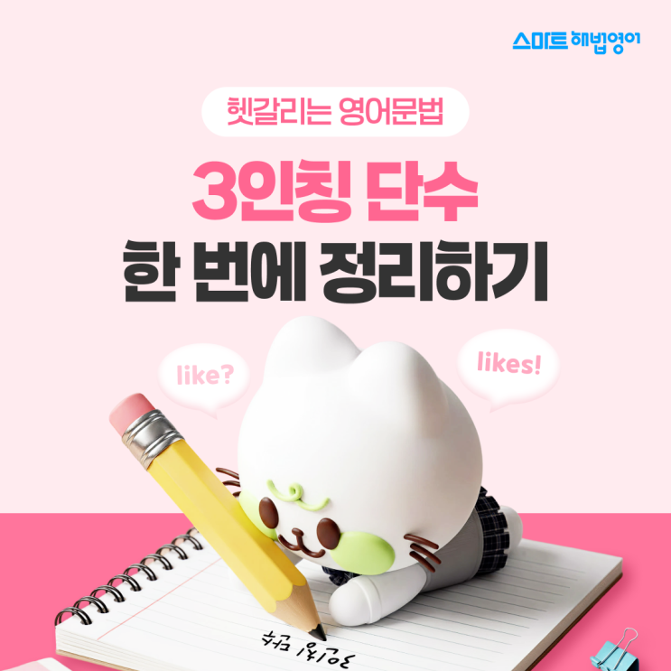 안녕하세요, 스마트해법입니다. 영어를 배우다 보면 아이들이 꼭 한 번쯤 이런 질문을 하죠. “왜 I like인데 He likes예요?” “왜 어떤 문장에는 s가 붙어요?” 처음 영어 문장을 배우는 아이들에게는 아주 자연스러운 궁금증입니다. 바로 이때 등장하는 개념이 3인칭 단수입니다. 사실 이 규칙은 복잡한 문법이라기보다 주어가 누구인지에 따라 동사의 모양이 조금 달라지는 간단한 규칙입니다. 이번 글에서는 초등학생도 쉽게 이해할 수 있도록 3인칭 단수 개념과 예문을 통해 차근차근 정리해 볼까요? 3인칭 단수란 무엇일까요? 3인칭 단수를 배우기 앞서, 먼저 ‘인칭’이라는 개념부터 간단히 살펴볼게요. 1인칭 : 말하는 사람 → I, We 2....... <img src="https://blogthumb.pstatic.net/MjAyNjA0MDNfMjQ5/MDAxNzc1MTc0NzYxOTg3.jchp88eKg-lhC-sqqbLFpOQ2NLYkO1qQYKUYPp7sNjsg.lmBv3ZOj9DAuchAmbIl1jQ1rSxqDOEXBO-5nANfeqogg.PNG/%BD%BA%B8%B6%C6%AE%C7%D8%B9%FD2026%B3%E24%BF%F9_%BF%B5%BE%EE_00%28%BA%ED%B7%CE%B1%D7%BD%E6%B3%D7%C0%CF%29.png?type=s3" />