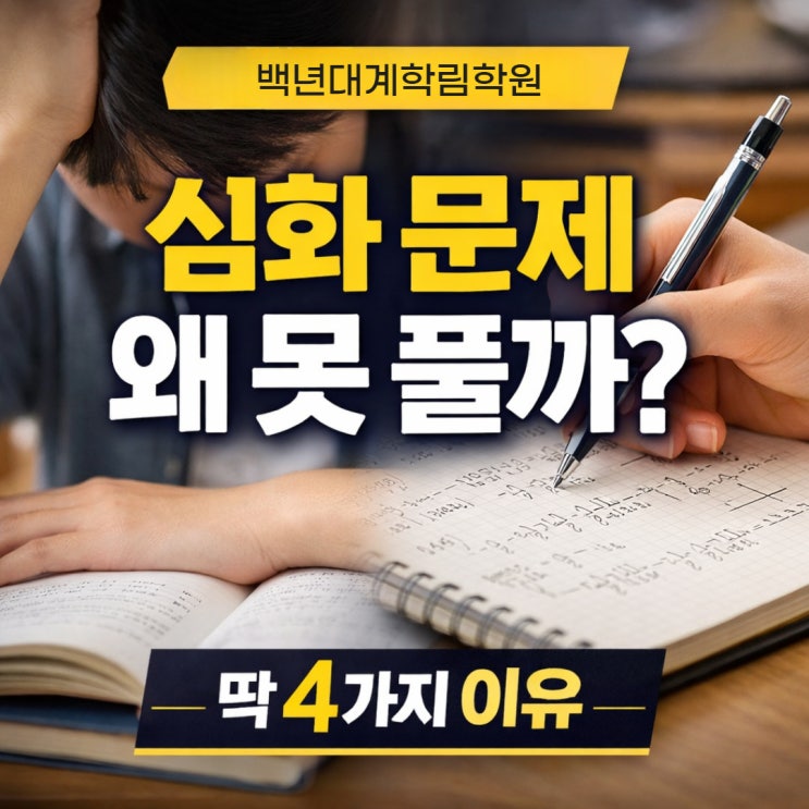 안녕하세요? 평촌 30여년의 전통 백년대계학림학원입니다 오늘은 학생들이 심화 문제를 풀지 못하는 이유에 대해서 알려드리겠습니다. 수학 전문 백년대계학림학원 1. 왜 기본은 되는데 심화가 안 될까? 많은 학부모님들이 이렇게 말씀하십니다. “우리 학생은 기본 문제는 잘 푸는데, 조금만 어려워지면 아예 손을 못 대요.” 이 상황, 꽤 흔합니다. 그리고 대부분 비슷한 원인을 가지고 있습니다. 단순히 “어려운 문제를 많이 안 풀어서”가 아닙니다. → 공부 구조 자체가 잘못되어 있는 경우가 훨씬 많습니다. 2. 심화 문제 못 푸는 학생의 4가지 공통점 1) 수학적 사고력이 부족한 경우 수학에서 심화 문제를 푸는 핵심은 결국 “생각하는....... <img src="https://blogthumb.pstatic.net/MjAyNjA0MDVfMjE3/MDAxNzc1MzcyNDE3OTk1.kCUlMnYYs9QnwA8QcC0nO-AvEIuA2hIPYaCHYMIXINQg.k_ueh9K6AzNvBjXxWJls_LqlaK4Eklmwgl9VJW7gg6Qg.JPEG/%C1%A6%B8%F1%C0%BB_%C0%D4%B7%C2%C7%CF%BC%BC%BF%E4_%2822%29.jpg?type=s3" />