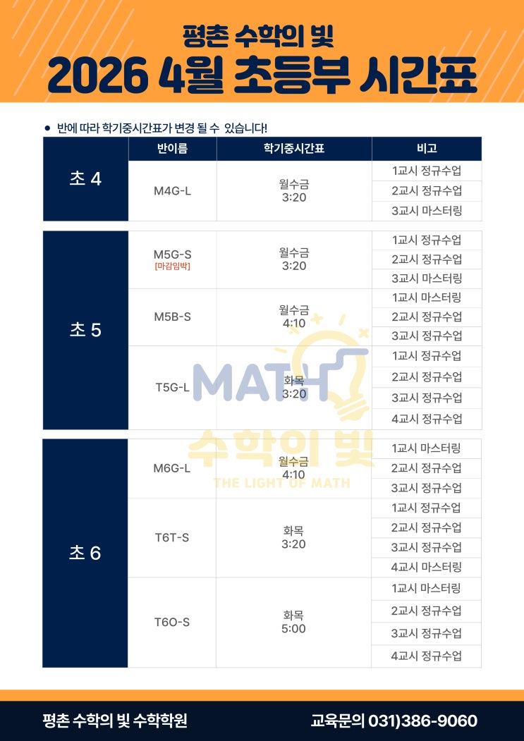 평촌수학학원 수학의빛, 2026년 4월 초등부 시간표 안내