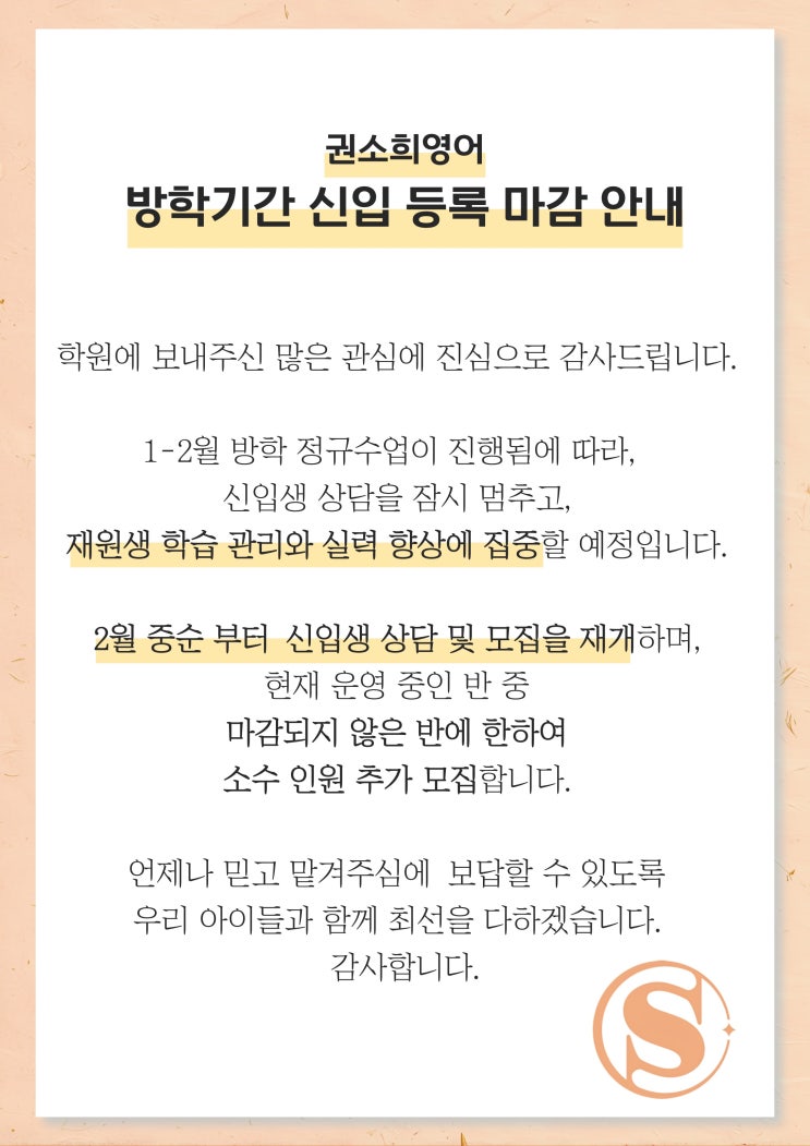 안녕하세요. 권소희영어입니다. 먼저 학원에 관심을 갖고 찾아주셔서 진심으로 감사드립니다. 1~2월 신입생 상담 운영 일정에 대해 미리 안내를 드리고자 합니다. 저희 학원은 언제나 재원생을 가장 우선적으로 생각하며 운영하고 있습니다. 1월 12일부터 방학 정규수업이 시작됨에 따라, 2월 중순까지 신입생 상담 및 모집을 일시 중단하고, 재원생 학습 관리와 실력 향상에 집중할 예정입니다. [신입생 상담 및 모집 일정 안내] 신입생 상담 재개 시점 : 2월 중순 - 2월 중순 이후 진행되는 신입생 상담은 3월 개학 이후 합류가 가능한 학생을 대상으로 하며, 현재 운영 중인 반 중 마감되지 않은 반에 한해 소수 인원만 추가 모집할 예정....... <img src="https://blogthumb.pstatic.net/MjAyNjAxMDlfMTU3/MDAxNzY3OTY4OTkyNzUy.7jGT37UucZpNUIB91fwco46DYldpzGHtJ4Ot7ZXaVyQg.biDey1bRTkY9zn55XDcrudHoCqhQG83Mlkaj1a-OHYEg.JPEG/KakaoTalk_20260109_232813844.jpg?type=s3" />