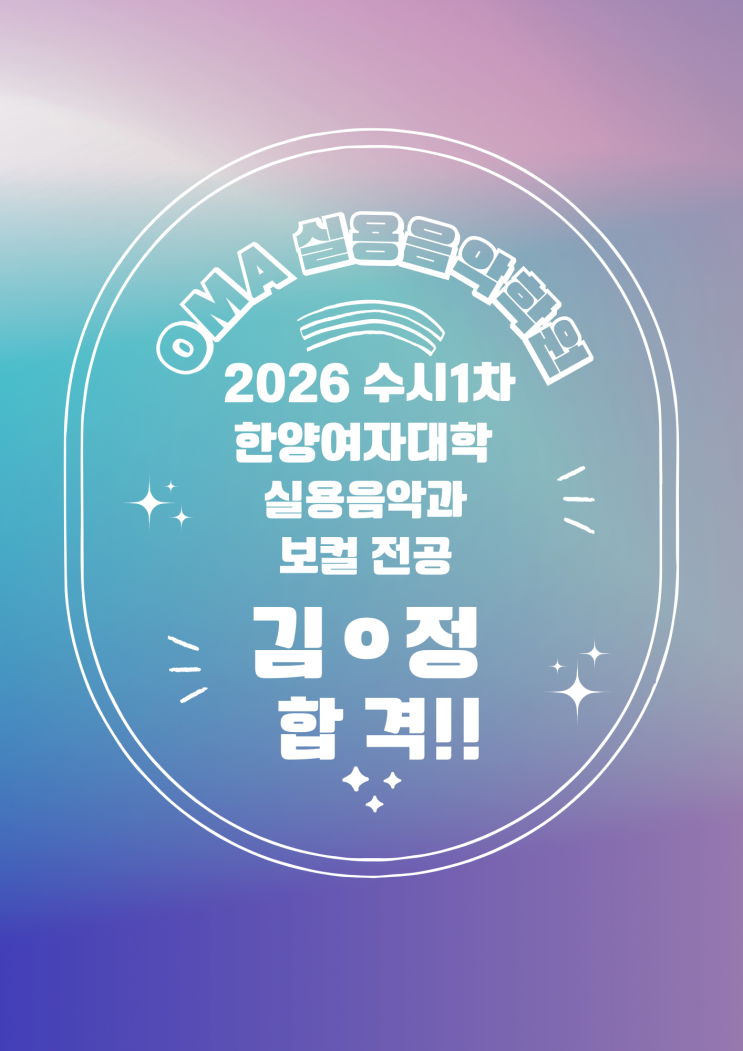 2026학년도 수시 1차 합격 소식!! 화정실용음악학원 오엠에이 합격자 배출현황 안녕하세요 여러분 2026학년도 수시 1차 전형에서 오엠에이 실용음악학원 수강생들이 또 한 번 결과로 증명했습니다.^^ ✔️ 한양여자대학 실용음악과 보컬 김0정 ✔️ 한양여자대학 실용음악과 피아노 배0림 ✔️ 강서대학교 실용음악과 미디작곡 박0화 각 전공별로 탄탄한 기본기 + 학교별 맞춤 전략을 통해 수시 1차 합격이라는 값진 결과를 만들어냈습니다. 화정실용음악학원 오엠에이는 ✔ 단순히 “음악을 잘하게 하는 곳”이 아니라 ✔ 실기 평가 기준을 정확히 분석하고 ✔ 학교·교수·전형별 전략을 설계하는 학원입니다. 특히 이번 수시 1차에서는 실....... <img src="https://blogthumb.pstatic.net/MjAyNTEyMzFfMTY3/MDAxNzY3MTYxNTg2NjUw.f1mdCn1daPFmL53Nrgw8H69sBpm8APffPzy5td2sQqMg.1ph_LLoEpH8hAWxF4cR59GV-Bgx4LzXH_VIKhN-_4J4g.PNG/%C7%D1%B8%B2-2.png?type=s3" />