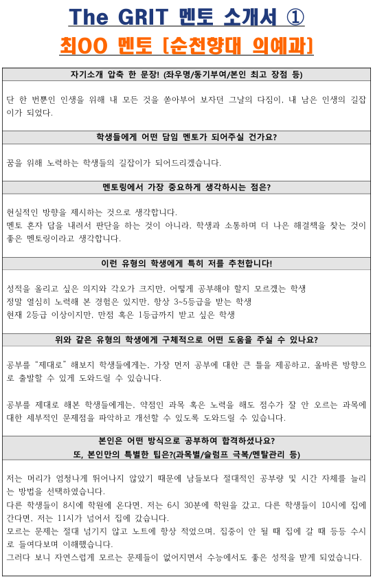 안녕하세요, 더그릿학원 입니다^^ 오늘부터 더그릿에 계시는 멘토분들을 한 분씩 보다 자세히 소개해드리려 하는데요, 첫 번째 주인공은 바로, 처음 이야기를 들었을 때 저희도 놀라움을 감추지 못했던 최OO 멘토 입니다. 최OO 멘토는 고등학교 시절, 눈에 띄는 상위권 성적을 유지하던 학생은 아니었습니다. 하지만 이후 확실한 각성과 태도 변화를 통해, 놀라운 성적 향상을 이루어 결국 의대 합격이라는 결과를 만들어내었습니다. 특히 인상 깊었던 점은, ‘해보겠다’는 결심을 한 이후엔 타고난 재능과 비교하기보다 본인만의 계획을 세우고 흔들림 없이 실천했다는 점 입니다. 절대적인 공부 시간을 확보하고, 하루하루를 성실하게 쌓아 올....... <img src="https://blogthumb.pstatic.net/MjAyNjAxMDdfMTgy/MDAxNzY3NzU1NTA4NjUy.ImA1SaE9SV3a0yNNMrHukmnlWQsl_Rk7XfnGZ08Skwwg.c0KCeaf6quuITZ-pr6xX1JcsH9DobbHULKGzn1uKZ00g.PNG/%BD%BA%C5%A9%B8%B0%BC%A6_2026-01-07_121125.png?type=s3" />