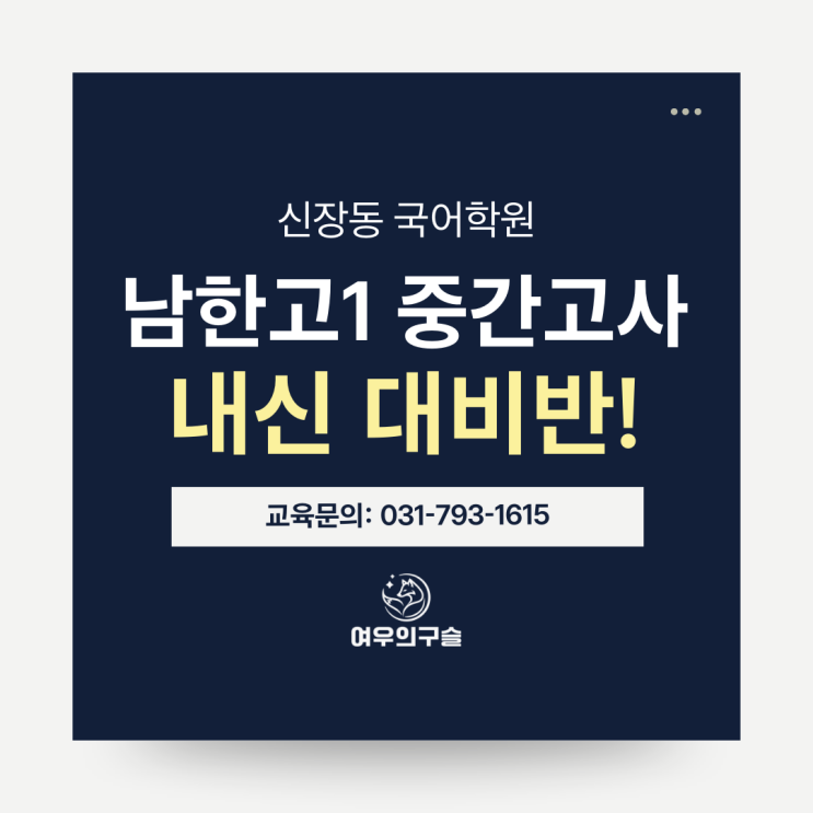 과정과 결과로 보답하는 신장동 국어학원, 여우의구슬 안녕하세요, 여우의 구슬입니다 중학교 때까지는 ‘읽고 느낌대로 풀기’가 어느 정도 통했지만, 고등 국어는 시험 범위가 넓고 출제 의도가 더 정교해져서 준비 방법이 달라집니다. 개학 시즌을 맞아 남한고1 국어 1학기 중간고사 대비반을 모집합니다. 이번 대비반은 첫 시험을 앞둔 1학년 학생들이 내신의 흐름을 잡고, 이후 수능까지 이어질 기본기를 탄탄히 만드는 데 초점을 두었습니다. 남한고1 국어 내신 대비반 안내 ✅ 개강 3월 8일(일) 오후 7시 ~ 10시 ✅ 수업 구성 정규 7회 + 직보 1회 ✅ 수업 범위 3월: 음운의 변동 + 산문 문학 독해법 4월: 남한고 맞....... <img src="https://blogthumb.pstatic.net/MjAyNjAyMjVfMjM2/MDAxNzcyMDEyNDk1NDY3.uGRpDtgyjC6ngW_wWDU6Elo-vBjDRp_1l-gV0I0eRJEg.jKPRBm6G2-KvhevrEwjfi2QrQMoWZkZNHHqeCijRG2Qg.PNG/1.png?type=s3" />