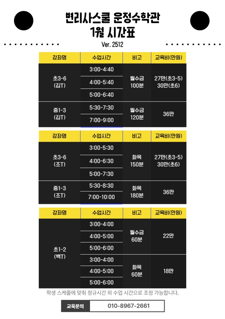 안녕하세요, 변리사스쿨 운정수학관입니다 2025년 1월 수업 안내 및 시간표를 공유해드립니다. 학년에 맞춘 커리큘럼과 정원제 운영으로 학생 한 명 한 명 꼼꼼하게 지도하고 있습니다. 수업 구성 안내 ✅ 초등부 • 학교 교과 진도 맞춤형 수업 • 시중 전 교과서 유형 분석 • 서술형 기출 문제 + 시험 대비 모의평가 • 레벨별 커리큘럼 • 학습 습관 형성 및 연산 기초 강화 ✅ 중등부 • 중학교 내신 대비 / 서술형 훈련 • 개념 → 응용다지기 → 심화까지 정리 • 정기 확인테스트 + 오답관리 시스템 운영 상담 및 등록 문의는 010-8967-2661 또는 카카오톡채널(@변리사스쿨수학관)로 주세요! #운정수학학원 #파주수학학원....... <img src="https://blogthumb.pstatic.net/MjAyNjAxMDZfMTQw/MDAxNzY3NzAyNDA1Njgz.04OmzHOhC6wXj5O7G4pdj1N7gWBBcV959JBm-Q1RMFMg.aKAGBhpqNbCPOJSDQHto8-Msk-229CGTZ4WkjhOWrsYg.JPEG/2026.1_%BD%C3%B0%A3%C7%A5_%BA%AF%B8%AE%BB%E7%BD%BA%C4%F0%BC%F6%C7%D0%B0%FC.jpg?type=s3" />