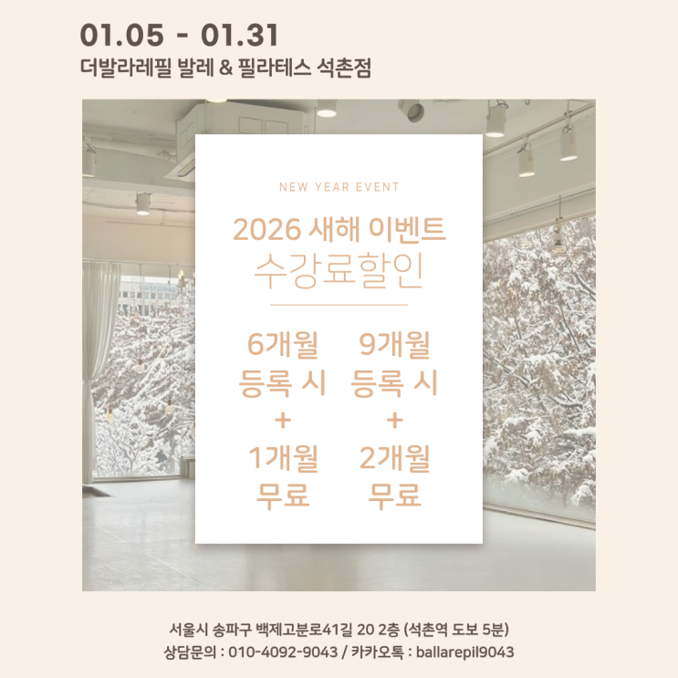 안녕하세요, 더발라레필 석촌점 민선쌤입니다. 2026년 새해가 밝았어요◡̈ 더발라레필과 함께해 주시는 모든 분들 감사합니다! 올 한 해 더 건강하고 더 행복하고 평온하시길 바랍니다. 새해 복 많이 받으세요♀️ 늘 함께해 주시는 감사한 마음을 담아 일 년에 단 한 번 진행하는 수강료 할인 이벤트를 안내합니다! 1월 한 달간, 기존 회원 및 신규 회원 모두에게 6개월 등록 시 1개월 무료/ 9개월 등록 시 2개월 무료 프로모션 진행합니다. 이번 기회 놓치지 말고 등록하시고 더발라레필에서 새해 운동 목표 새롭게 시작해 보세요 *이벤트 수강권은 환불 불가합니다. 더발라레필 발레&필라테스 석촌점 문의: 010-4092-9043 카카오....... <img src="https://blogthumb.pstatic.net/MjAyNjAxMTBfMjg4/MDAxNzY4MDEwMDYzMjI0.COy5QEUe7rAVFJ6VDNpvyVwIx_1bdnqOlPz7-kXoxw4g.7iiam17O2IXkI3RT-LUO3ZufekVo7a0Q6xXOIVqRJbAg.PNG/%C1%A6%B8%F1%C0%BB_%C0%D4%B7%C2%C7%D8%C1%D6%BC%BC%BF%E4._%289%29.png?type=s3" />
