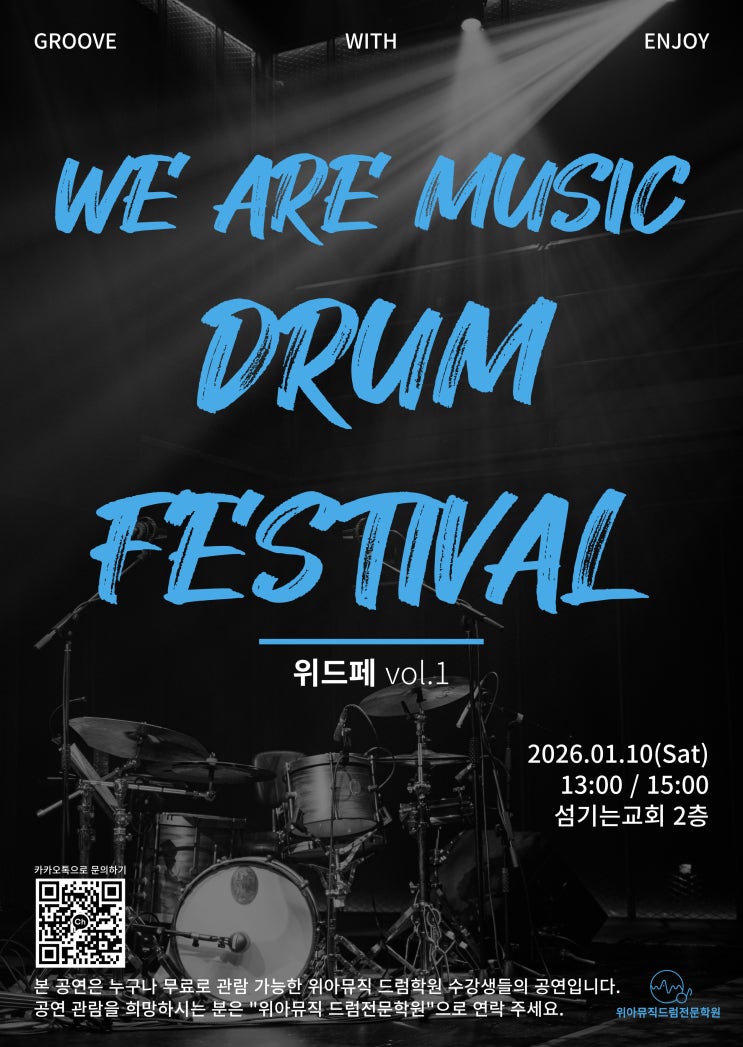 위아뮤직 드럼페스티벌 안내 한 해를 마무리하고, 새로운 해를 맞이하며 준비한 특별한 연주회 위아뮤직 드럼전문학원에서는 2026년을 맞이하며 회원님들과 함께하는 "위아뮤직 드럼페스티벌" 을 준비하고 있습니다 공연 소개 이번 공연은 초등학생부터 성인 회원님들까지 각자의 스타일로 준비한 다양한 장르의 곡들을 무대 위에서 직접 연주하는 자리입니다. 연습의 결과를 무대에서 직접 만나보세요! 공연 일정 및 장소 • 2026년 1월 10일(토) • 13시 / 15시 (총 2회 공연) • 섬기는교회 2층 관람 안내 • 전 공연 무료 관람 • 누구나 관람 가능 관람 문의 및 안내 이번 공연은 회원님 가족....... <img src="https://blogthumb.pstatic.net/MjAyNTEyMjRfMTM2/MDAxNzY2NTc0MTQ3MTA4.JpPoLl911rlyAUOL1om-acfBZqZ2q89hc894-6sES4Ag.wJ6nELh7lFdrPTKGay7qyunvC9HfH15RjQq4ABUElQog.JPEG/%C0%A7%B5%E5%C6%E4%C6%F7%BD%BA%C5%CD1-001_%281%29.jpg?type=s3" />