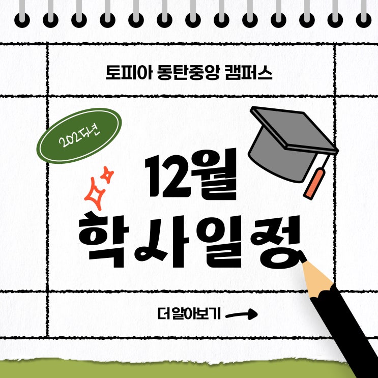 토피아 동탄중앙 캠퍼스 12월 학사일정을 안내드리니 참고하시어 학습에 차질 없도록 부탁드립니다. TOPIA 겨울학기 개강 12월 1일 (월) ~ 2일 (화) 토피아 겨울학기가 개강됩니다. 겨울학기는 12월부터 26년 2월말까지 3개월 간 진행됩니다. 12월 1일 (월) 초중 월수금 반 12월 2일 (화) 초중 화목/ 화목금 반 TOPIA 예비고1 개강 12월 1일 (월) ~ 2일 (화) 토피아 예비고1반이 개강됩니다. 고등학교 영어는 중학교와 다르게 더 심화된 어휘와 문법, 그리고 독해 능력을 요구합니다. 고등학교 입학 전 중요한 준비 단계인 만큼, 체계적이고 효율적인 커리큘럼으로 여러분의 학습을 완벽하게 지원합니다! 학교별 내신대비 최종 종료 ~ 12월 19일....... <img src="https://blogthumb.pstatic.net/MjAyNTExMjZfMTEw/MDAxNzY0MTU1NTk4NTQ5.R-jCtsyhKcj9BZ9OyWEehyOyxZQFZ-tbWpxZzQKwjAEg.P22AxdedZxLEe7Y4ASbho-cIokXMfysCDxRkxS4LPw8g.JPEG/12%BF%F9-%C7%D0%BB%E7%C0%CF%C1%A4.jpg?type=s3" />