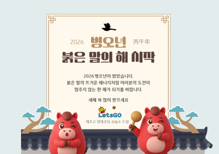 안녕하세요. 레츠고 영재코딩 교습소 입니다. 2026년 병오년 새해가 밝았습니다. 2026년은 붉은 말의 해 라고 해요! 붉은 말이라고 하니 삼국지 관우의 명마 적토마가 생각납니다. ^^ 하루에 천리를 달린다는 빠르고, 에너지 넘치는 말 이라고 하니 2026년 행복한 에너지 가득한 한해 되세요! 2025년 초등학생 미만의 유아 친구들은 교육비 납입 증명서를 요청하실 수 있습니다. 2025년 초등학교 입학생의 경우엔 1,2월 결제비가 있다면 동일하게 요청 가능합니다. ^^ 1월 12일 월요일 부터 초등학생 엔트리/스크래치 자격증 겨울방학 특강이 진행됩니다. 레츠고 영재코딩 교습소 학생의 경우 특강 수업료가 할인 됩니다. (1/12~ 2/13 : 5주간,(수....... <img src="https://blogthumb.pstatic.net/MjAyNTEyMzBfMTkz/MDAxNzY3MDg0MDE2MjAy.QlHFmVgQ3RH11pdE-yw695pVrvYwyJdxqYk-mn4enhUg.nGRVG-WgbMuBt1PvMinSEbumAZ_DMEkGDX85Ne-M6kcg.PNG/image.png?type=s3" />