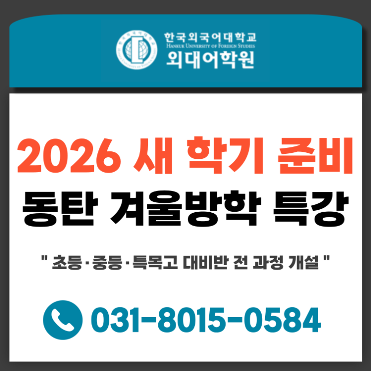 안녕하세요, 중·고등 입시 전문 동탄외대어학원입니다. 다가오는 2026년 새 학기, 자녀의 영어 실력과 입시 경쟁력을 결정지을 골든타임인 겨울방학이 다가오고 있습니다. 변화하는 교육 과정과 갈수록 치열해지는 입시 환경 속에서, 흔들리지 않는 실력을 갖추기 위해선 확실한 방향을 가지로 움직이는 것이 중요한데요! 고민이 깊어질 우리 학생들을 위해 동탄 겨울방학 특강을 준비하였습니다! 이번 특강은 본원 재원생은 물론, 실력 향상을 갈망하는 외부생들까지 모두 수강할 수 있도록 문을 활짝 열었습니다. 동탄외대어학원에서 초등부터 예비 고등까지 학년별 로드맵에 맞춰 준비한 커리큘럼을 자세히 안내해드리겠습니다! 1. [초등부] 영....... <img src="https://blogthumb.pstatic.net/MjAyNTEyMzFfMTMw/MDAxNzY3MTYwMDU0Mjk0.Yvwg-3OmPF7lt5zRwa3Y_AmYWVSciRIhOveFjqWADT4g.rgfCysfs1HKvqTbyu1KCXYu0L5vG6dc7bU1sTfp8A-0g.PNG/%B5%BF%C5%BA%BF%DC%B4%EB%BE%EE%C7%D0%BF%F80807-001.png?type=s3" />