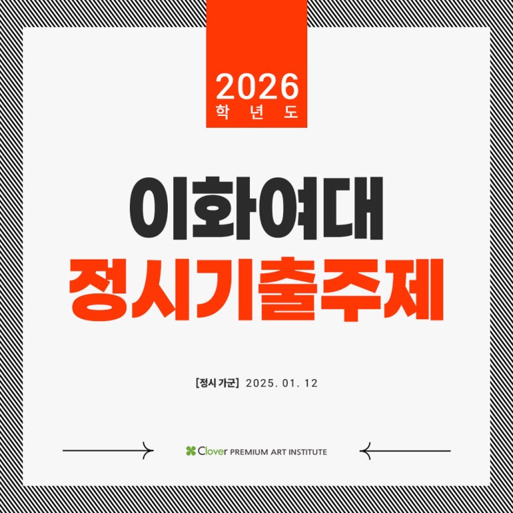 2026학년도 이화여대 통합실기 기초소양 정시 주제 안녕하세요! 미대입시전문 동탄 클로버미술학원입니다. 이번 안내드릴 기출주제는 미대입시에서 최상위권 대학 중 하나인 이화여자대학교의 정시 가군 통합실기(기초소양) 기출주제를 소개해드리려고 합니다 :) 실기고사는 조형예술학부, 디자인학부 모두 1월 12일 진행되었으며 조형예술학부는 문제의 내용을 통해 다양한 재료로 표현하는 유형, 디자인학부는 화지를 2등분하여 2가지의 문제를 풀이해야 하는 유형입니다. 디자인학부의 문제는 대체적으로 한쪽에는 평면조형, 다른 한쪽에는 대상물의 요소를 통한 디자인문제가 출제되는데요. 타 학교와 다르게 2절에 시험을 진행하는 만큼 시....... <img src="https://blogthumb.pstatic.net/MjAyNjAyMTRfMTAw/MDAxNzcxMDM1MDY4NTgy.c5dbdx5uEsnxiGLYM5FLzqH9evAc13iImYD6Wv76x88g.Sno6s2SOoTw8Jj8Bdh1ohqVITEgCaebOCrkBbyx71twg.JPEG/1.jpg?type=s3" />