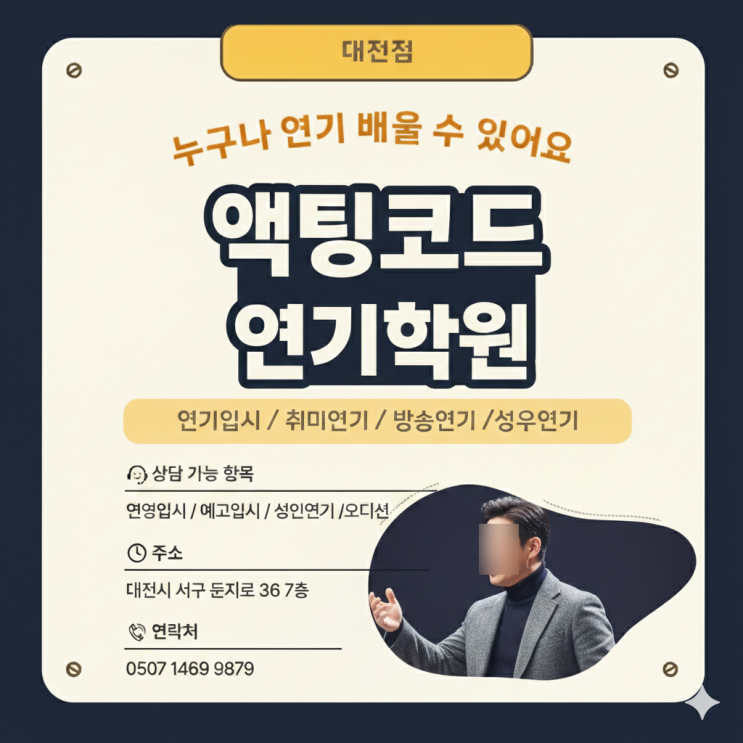 대전 대전연극영화 입시모집 소수정예 연기학원 안녕하세요 액팅코드 연기학원입니다. 오늘 전해드릴 소식이 있어 명절 연휴 중간에 와서 이렇게 글을 남겨 봅니다~ 대전연기학원 예고반.예비반 모집 중이니 많은 관심 부탁드립니다! 현재 5기를 모집 중인데요 선착순 5명!! 파격 할인도 진행 중이에요 이번 5기 모집 중 오시게 되면 30%나 할인 중이니 많은 관심 바랍니다. 최근 들어 5기 모집 중이라는 소식을 듣고 찾아 오시는 학생 분들이 부쩍 많이 늘어난 상태이기도 한데요 액팅코드 연기학원의 경우 현직 대학 교수님께서 직접 수업을 해 주시고 1:1 밀착 개인 관리가 가능한 액팅코드 연기학원이라서 대전 이외에도 세종, 부여, 공주에....... <img src="https://blogthumb.pstatic.net/MjAyNjAyMTVfNDIg/MDAxNzcxMTQyNzA0NTM2.FRAGIba_sBcl5wJ7TyqbT3bvElUVPqHWlhzl-fKEZ3Ig.4Cbrtvl1VVjuwb4KDck9AGRPLB86kfnXFKD1VtDvHK0g.PNG/Gemini_Generated_Image_nov13lnov13lnov1.png?type=s3" />