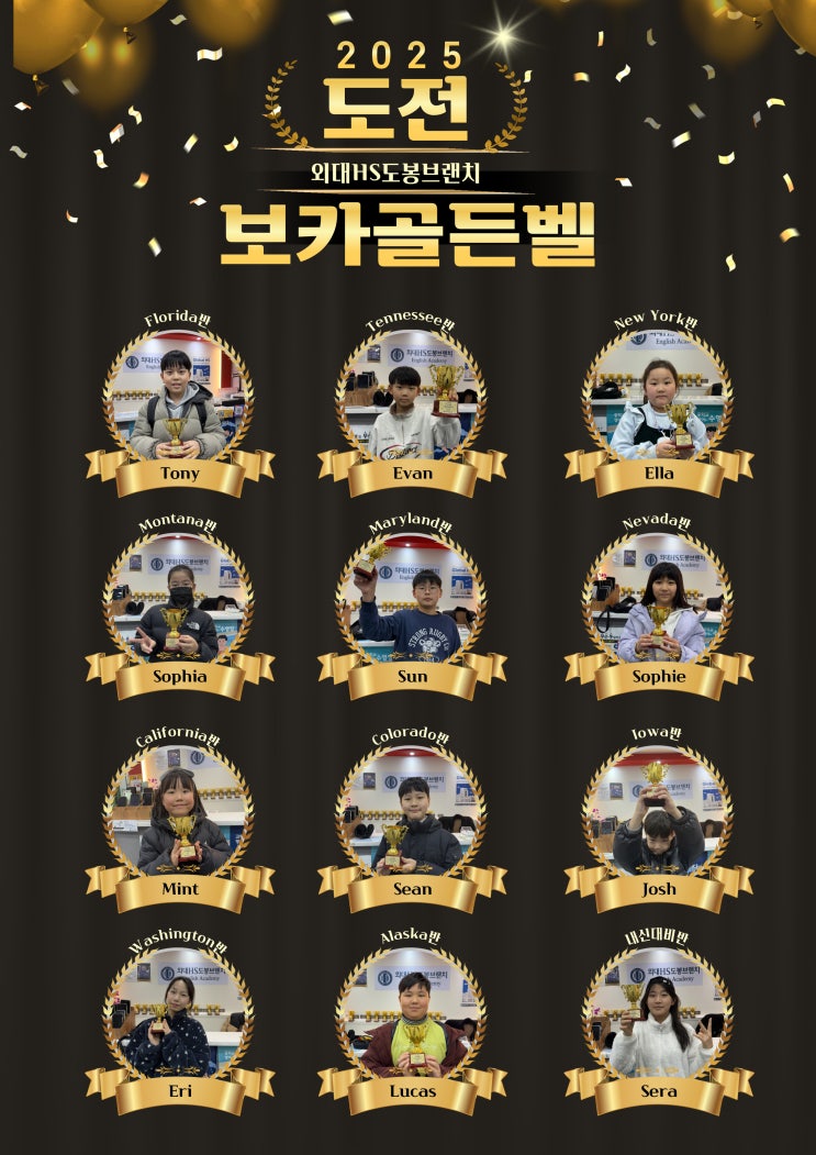 이번 보카 골든벨은 각 반별로 진행되었는데요, 단순한 암기 테스트가 아닌 매일의 단어 테스트, 오답 정리, 반복 학습을 성실하게 이어온 결과가 이렇게 눈에 보이는 성과로 이어졌습니다. 우승한 학생들과 도전한 학생들 모두 큰 박수를 보냅니다❤ WINNERS New York반 Ella Alaska반 Lucas Nevada반 Sophie Maryland반 Sun Florida반 Tony Washington반 Eri Colorado반 Sean Montana반 Sophia Tennessee반 Evan California반 Mint Iowa반 Josh 내신대비반 Sera 현장스케치 보카 골든벨을 통해 단어 학습의 중요성을 다시 한번 느끼고, “나도 하면 할 수 있다”는 자....... <img src="https://blogthumb.pstatic.net/MjAyNjAxMTNfMTQw/MDAxNzY4Mjk4OTY2NjM4.4I5KN9d6DpZiA39U4ZzHjCrwUDAuAzw84NWoBZawuJUg.XkfVgSC1mTuevQfOqFjS3l740fmjZUc_ARNoLmUDhEcg.JPEG/%B0%F1%B5%E7%BA%A7-%BE%C8%B3%BB%B9%AE-001.jpg?type=s3" />