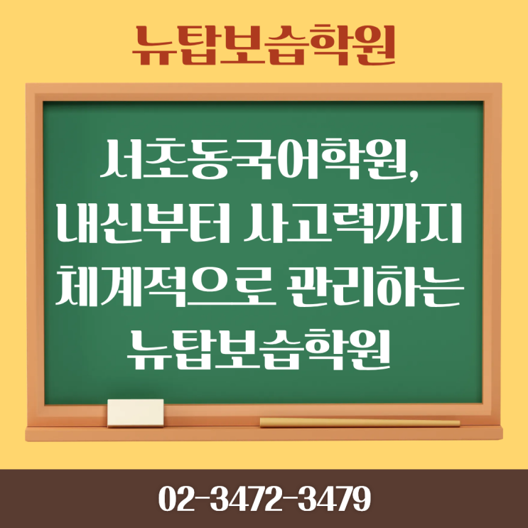 안녕하세요 서초동국어학원 뉴탑보습학원입니다. 국어는 공부를 하고 있어도 성과가 바로 보이지 않아 답답해지는 과목입니다. 서초동에서 이런 고민을 가진 중·고등 학생들을 위해 국어 과목을 안정적으로 관리하고 있습니다. 국어는 다른 과목과 달리 공부 방법이 눈에 잘 보이지 않아 혼자 공부하기 어려운 과목입니다. 그래서 방향 없이 문제만 풀다 보면 노력에 비해 성과가 잘 나오지 않는 경우가 많습니다. 뉴탑보습학원은 이 지점을 관리로 해결합니다. 서초동국어학원 뉴탑보습학원은 학생의 현재 국어 수준을 먼저 정확히 파악하는 것부터 수업을 시작합니다. 읽기 이해력, 문제 접근 방식, 답안 작성 습관까지 점검해 학생마다 다른 학....... <img src="https://blogthumb.pstatic.net/MjAyNjAxMDVfMTEw/MDAxNzY3NTgwNDM5MjMw._yc5RtXS_5c88nHzrnLy699OFTynLdpJvf-Yi4U_tpcg.zhuJN5guwGQmD4sO-Dzjm9daZ8ywUFmaH7LUPjKN7OQg.PNG/22-%B4%BA%C5%BE%BA%B8%BD%C0%C7%D0%BF%F8.png?type=s3" />