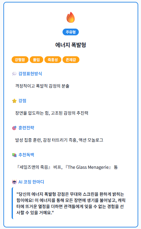 Actor Lab 12가지 연기 유형, 당신은 어떤 배우인가요? 안녕하세요, 수액터스 & Actor Lab입니다. 지난 포스팅에서 Actor Lab 진단 테스트를 소개해드렸죠. 많은 분들이 테스트를 완료하고 결과를 확인하셨습니다. 그런데 이런 질문들이 들어왔어요. "진정성의 화신형이 나왔는데, 정확히 어떤 의미예요?" "저는 에너지 폭발형인데, 이게 제 강점인가요?" 오늘은 Actor Lab이 분류한 12가지 연기 유형을 하나하나 자세히 설명드립니다. 당신의 유형을 아직 확인하지 않으셨다면? [Actor Lab 무료 진단 먼저 하기] Type 1. 진정성의 화신형 "침묵 속에서도 울림이 있는 연기" 조용하지만 깊....... <img src="https://blogthumb.pstatic.net/MjAyNjAxMThfMjMx/MDAxNzY4NzA1MTYwODE5.t3lMP0ShlI1YWjuzhi_ewDqL3ZOWPgnuaIRe6Osv-X4g.Ama6aVLq8aZBiNY-f3x1mcgevJUoPrQNw8X0MQ__8b8g.PNG/image.png?type=s3" />