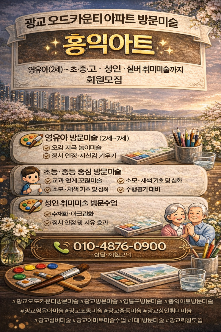 광교오드카운티아파트 거주 학부모님들께 안내드립니다. 이제 미술학원 이동 없이 집에서 편안하게 1:1 방문미술 수업을 받아보세요. 홍익아트 방문미술은 영유아(2세)부터 초·중·고, 성인 취미, 실버미술까지 연령별 맞춤 커리큘럼으로 체계적으로 진행됩니다. 상담문의 010-4876-0900 영유아 방문미술 (2세~7세) ✔ 오감 자극 놀이미술 ✔ 촉감 · 색채 탐색 활동 ✔ 정서 안정 · 자신감 형성 ✔ 집중력 기초 발달 이 시기의 미술은 결과보다 과정 속 경험과 표현력 형성이 가장 중요합니다. 집에서 진행되는 수업이라 아이의 성향에 맞춘 안정적인 수업이 가능합니다. 초등 · 중등 중심 방문미술 ✔ 교과 연계 표현미술 ✔ 관찰....... <img src="https://blogthumb.pstatic.net/MjAyNjAzMDNfMzAg/MDAxNzcyNTM4OTQzNTgz.bqWDj6bb0eFEOb4La06MTDQi-abfMxr2iN5XTnODt94g.cAO0RXzpQ-M-ta-8RMPNAruvFuCWlOQ4mzwGIjNYaicg.PNG/%B1%A4%B1%B3%BF%C0%B5%E5%C4%AB%BF%EE%C6%BC%C8%AB%C0%CD%BE%C6%C6%AE.png?type=s3" />