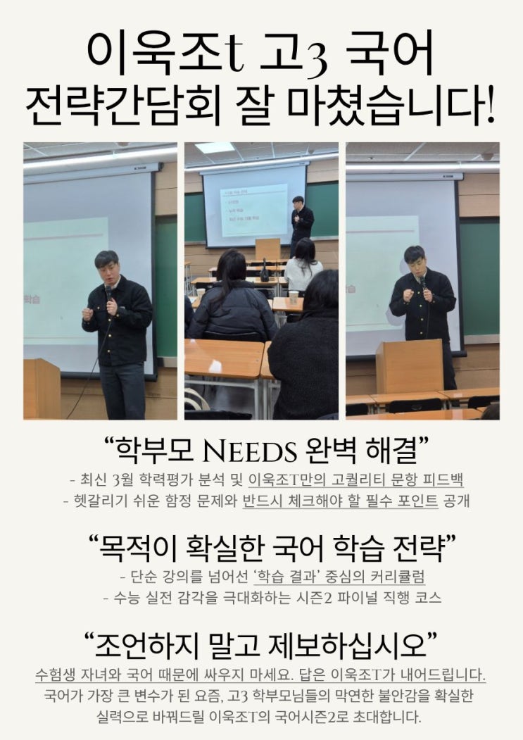 이욱조T 수능국어 완전정복 고3 학부모 간담회를 마쳤습니다! ★ 시대인재N 대치 재종 국어 실전모고 특강 마감 ! (23.24년) ★ ★ 시대인재N 대치 재종 국어 수강생 만족도 97% ★ 수업 시간- [일] AM 9:30 - 12:30 3 / 1일 개강 【 수능 국어는 처음부터 이욱조 ! 】 대치동 갈 필요가 없습니다! ✅최적화된 커리큘럼 [ 단언컨대 그 어디에서도 볼 수 없는 학생 중심의 체계적 시스템 ! ] ' 기출분석 접근법 확립 ' - 평가원이 요구하는 개념어 정리 - 각 장르별 명확한 접근법 확립 - 접근법 체화를 위한 과제(주간욱조)와 리뷰 ✅빈틈없는 관리시스템 - 학교별 내신 교재 매주 제작 및 중간기말 적중 자료 / 맞춤 상담 / 실전....... <img src="https://blogthumb.pstatic.net/MjAyNjAzMDVfMjU4/MDAxNzcyNzEzMDkzOTcz.P4ehugcERh_AI9XG37ld6_RuJr6QiPJrpYpWZSuhMacg.BjbAjsjVckkHBeO5ZvVeIS29fQ2CUlLOi0lQPfjmUesg.JPEG/1.jpg?type=s3" />