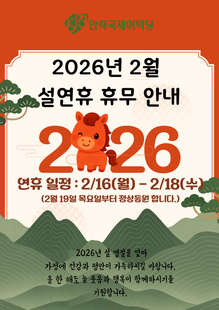 안녕하세요 안락국제어학당입니다! 2026년 설 연휴 안내드립니다. 연휴 일정: 2월 16일 (월) ~ 2월 18일 (수) (2월 19일 목요일부터 정상 등원 합니다.) 설 명절 인사드립니다. 지난 한 해 보내주신 믿음과 응원에 깊이 감사드립니다. 새해에는 우리 아이들이 더욱 성장하고 꿈을 향해 한 걸음 더 나아가는 한 해가 되기를 바랍니다. 가정에 건강과 행복이 가득하시길 기원합니다. 새해 복 많이 받으세요! <img src="https://blogthumb.pstatic.net/MjAyNjAyMTNfOTAg/MDAxNzcwOTc1NDc0NzM3.tMlPZTugKIZKEo9Y2USdbHJ3BbXkZU-7ffxFGTrO00cg.uIO3rp525XXH5ydcwrDxJg-FoBwkwwpyVrXLCK4LoVMg.PNG/%C1%A6%B8%F1%C0%BB_%C0%D4%B7%C2%C7%D8%C1%D6%BC%BC%BF%E4..png?type=s3" />