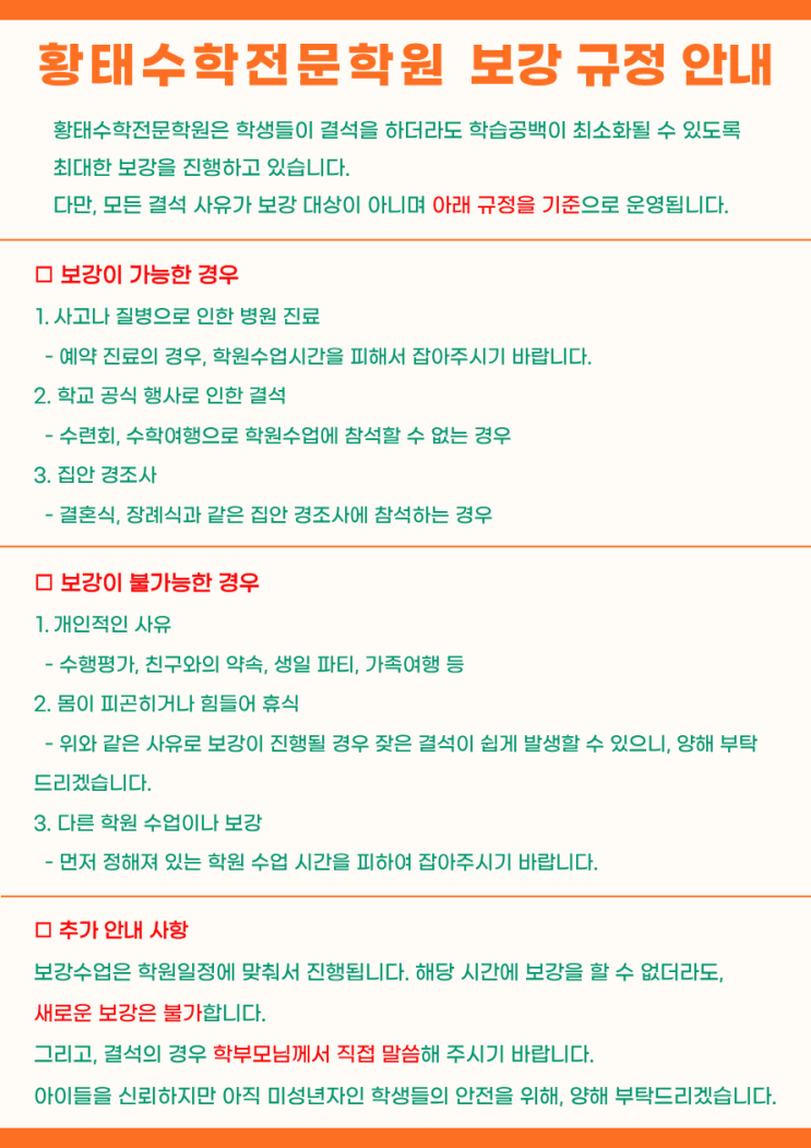 안녕하세요. 황태수학전문학원입니다. 황태수학전문학원은 우리 학생들의 학습 흐름을 안정적으로 유지하기 위해 보강 수업 규정을 위와 같이 정하였습니다. 학생 한 명 한 명의 학습 공백이 생기지 않도록 최선을 다하겠습니다. 궁금하신 사항은 언제든지 문의 부탁드립니다. 감사합니다. 황태수학전문학원 드림. 상담문의 전화상담 : 051-505-3008 문자문의 : 010-5130-3008 <img src="https://blogthumb.pstatic.net/MjAyNjAyMTVfMjQy/MDAxNzcxMDk1MjAwNjg4.8FmglOSOM-sRrVpktynzS1LXrhGYNrgpUV2ady6JS-cg.uLRbmgpqxP6F3GgTWb0eGLNLmZcv0Jv2IGzleJyJPF8g.PNG/%C1%A6%B8%F1%C0%BB_%C0%D4%B7%C2%C7%D8%C1%D6%BC%BC%BF%E4._%281%29.png?type=s3" />