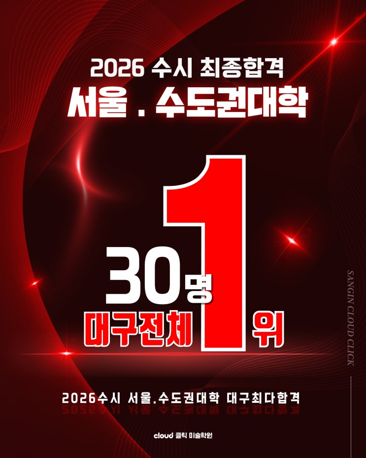 [ 2026 서울.수도권 수시합격자 대구전체 1위 ] 안녕하세요~ 대구미술학원 대구입시미술학원 상인동미술학원 달서구미술학원 신월성미술학원 상인클릭미술학원입니다~ 오늘은 저희 상인클릭이 2026학년도 서울.수도권 수시모집에 30명이라는 합격자를 배출하며 대구전체 1위를 차지한 2026 서울.수도권 수시합격자 소식입니다. 2026 수시모집에서 서울.수도권 30명합격!!이라는 엄청난 결과를 이뤄내며 대구전체 압도적 1위!!를 차지한 상인클릭입니다. 국민대학교 1명 합격! 경희대학교 2명 합격! 한양대학교 2명 합격! 홍익대학교 4명 합격! 건국대학교 3명 합격! 성신여대 1명 합격! 동덕여대 3명 합격! 단국대학교 3명 합격! 명지대학교 2명....... <img src="https://blogthumb.pstatic.net/MjAyNjAxMDdfMjQg/MDAxNzY3NzUzMjE0NzAy.O3xLztq-By7SxJkZJVwWuC2dlXyyskzkTN7NWi-6ZP4g.d_hLxwq4DBOyHVJxQC9zIrwx6wdHmyzUBwRcOe_fg0Ig.JPEG/1.jpg?type=s3" />
