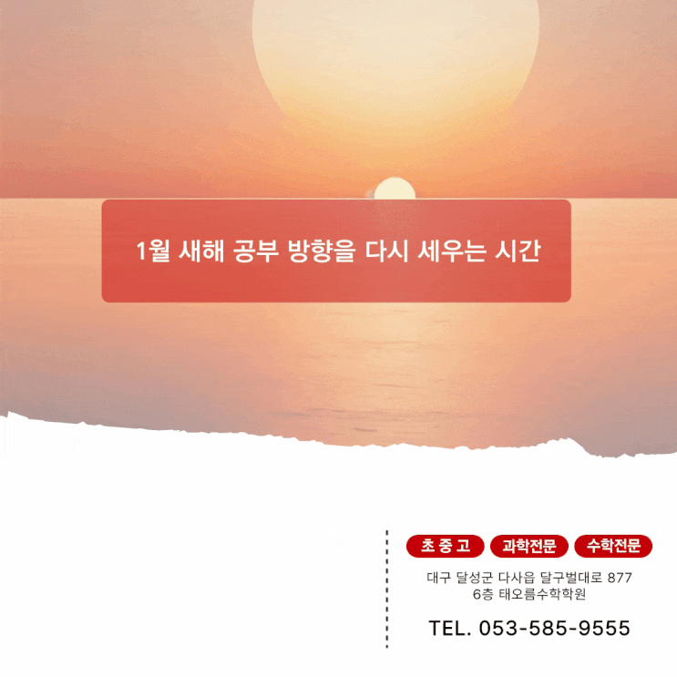 안녕하세요. 다사 수학학원 태오름수학과학학원입니다. 새해가 시작되는 1월은 마음만 앞서기 쉬운 시기이기도 합니다. 다사 수학학원 태오름수학과학학원에서 학생들을 만나보면 새해를 맞아 무엇을 어떻게 공부해야 할지 막연해하는 경우가 적지 않습니다. 이 시기에는 계획을 많이 세우는 것보다 공부의 방향을 정확히 잡는 일이 훨씬 중요합니다. 1월 학습의 핵심은 속도가 아니라 기준입니다 새해가 되면 진도를 빨리 나가야 할 것 같다는 압박을 느끼는 학생들이 많습니다. 하지만 1월 학습의 핵심은 속도가 아니라 기준입니다. 지금 자신의 실력이 어느 지점에 있는지, 어떤 개념을 정확히 이해했고 무엇이 불안한지를 먼저 점검해야 합니....... <img src="https://blogthumb.pstatic.net/MjAyNjAxMDhfMjQ3/MDAxNzY3ODYzNTM4Njk0.IcZbUOJDugjBMzc4EXQ9Sg5JbhAlSRCS-0k8QGre6Vog.eW5k65DOrcjPjm7Q6ZJ1a8x4g1zhEJn8pZlkHVTsVZAg.GIF/%A1%DA%A1%DA%C5%C2%BF%C0%B8%A7%BC%F6%C7%D0%C7%D0%BF%F8.gif?type=s3" />