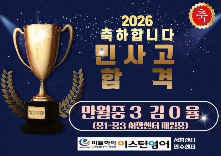 안녕하세요 문법과 단어가 강한 영어학원 서창동 영어학원, 서창2지구 영어 학원, 중고등 초등고학년 전문 서창동영어학원 20년 전통의 미들하이 이스턴영어학원 서창센터입니다. 최근 수시대학 합격소식과 고등의 합격의 소식들로 기쁜 나날을 보내고 있습니다. 오늘도 이곳에 합격을 소식을 알리게 되어 매우 기쁩니다. 인천뿐만 아니라 남동구 전체와 서창동지역에서 아마 민족사관고(민사고) 합격은 매우 드문 사례로서 축하해주고 싶어서 이 글을 작성합니다. 만월중 김 0율 학생, 민사고 합격을 진심으로 축하합니다 본원의 미들하이 이스턴영어 서창센터학원에 중1부터 지금까지 재원했었던 만월중 3학년 김 0 율 학생이 입학이 까다롭기....... <img src="https://blogthumb.pstatic.net/MjAyNjAxMDdfMTUw/MDAxNzY3NzU1NzAzNDQ3.vra1jGLWSB-x1FWJbsoO02ewp--D6GFnwz59TAxPsw8g.c8Cr-xXinbudGRutvDwAvn3WkEUTMQKxOlJM4GP5YNMg.JPEG/%B9%CE%BB%E7%B0%ED%C7%D5%B0%DD_A4%B0%A1%B7%CE%C7%FC.jpg?type=s3" />