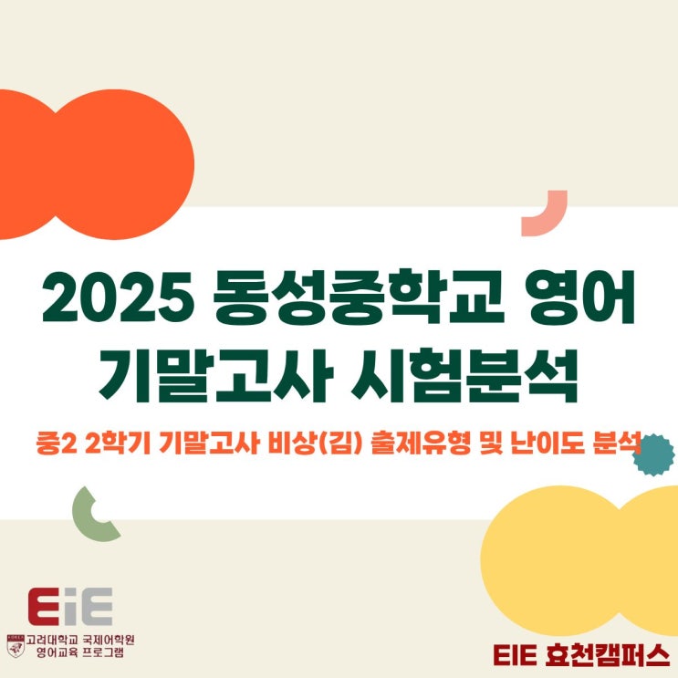 2025 동성중학교 중2 영어 기말고사 분석 중학교 영어는 초등 영어와는 완전히 다른 방향으로 흘러갑니다. 이번에 분석한 동성중학교 중2 2학기 기말고사 영어 시험지를 보면, 그 차이가 아주 분명하게 드러납니다. 시험 구성부터 살펴보면 총 28문항 배점 구조 듣기 30점 객관식 60점 서술형 10점 겉으로 보면 “객관식이 많네?” “서술형은 2문제뿐이네?” 라고 생각하실 수 있습니다. 하지만 실제 내용은 전혀 다릅니다. 문제 유형별 출제 특징 이번 시험은 7과·8과 본문 중심 출제가 핵심이었습니다. ✔ 단순 암기형 문제 거의 없음 ✔ 본문 내용 이해를 바탕으로 한 문제 다수 ✔ 어휘·어법·내용 이해가 동시에 요....... <img src="https://blogthumb.pstatic.net/MjAyNTEyMjRfMjY0/MDAxNzY2NTY2NTk3MDcw.HjoAsl3S-wwefifzW-_RxfAKvbTiwrUzPf6vtykVQTYg.3PWPn3DQGemmZrWLMhczZRgCDf3o9kQ9kY996cAK7Oog.JPEG/KakaoTalk_20251224_173339052.jpg?type=s3" />
