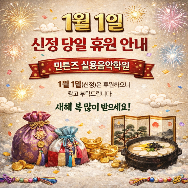 Happy New Year 2026 ✨ 새해 복 많이 받으세요 ✨ 민튼즈 실용음악학원을 찾아주시는 모든 분들께 건강과 행복이 가득한 한 해가 되길 바랍니다. 1월 1일(신정) 당일은 휴원입니다. 새해 첫날, 소중한 분들과 따뜻하고 즐거운 시간 보내세요 2026년에도 민튼즈와 함께 멋진 음악 만들어가요 #민튼즈실용음악학원 #민튼즈음악학원 #광산구실용음악학원 #광산구음악학원 #수완지구실용음악학원 #수완지구음악학원 #수완동실용음악학원 #수완동음악학원 #광산구보컬학원 #광산구피아노학원 #광산구기타학원 #광산구드럼학원 #보컬레슨 #피아노레슨 #기타레슨 #드럼레슨 #베이스레슨 #수완초 #수완중 #수완고 #수완하나중....... <img src="https://blogthumb.pstatic.net/MjAyNTEyMzFfMTA2/MDAxNzY3MTYyODY4ODMy.QwoDnF2Yg5s_5zI39mEgZHYkA4jROqTWCU5mQ_qLUfAg.jBha4ZxlxHmT4nW49oyJz4yuDAEwNqGHLZw2JK2EPC0g.PNG/KakaoTalk_20251231_151805950.png?type=s3" />