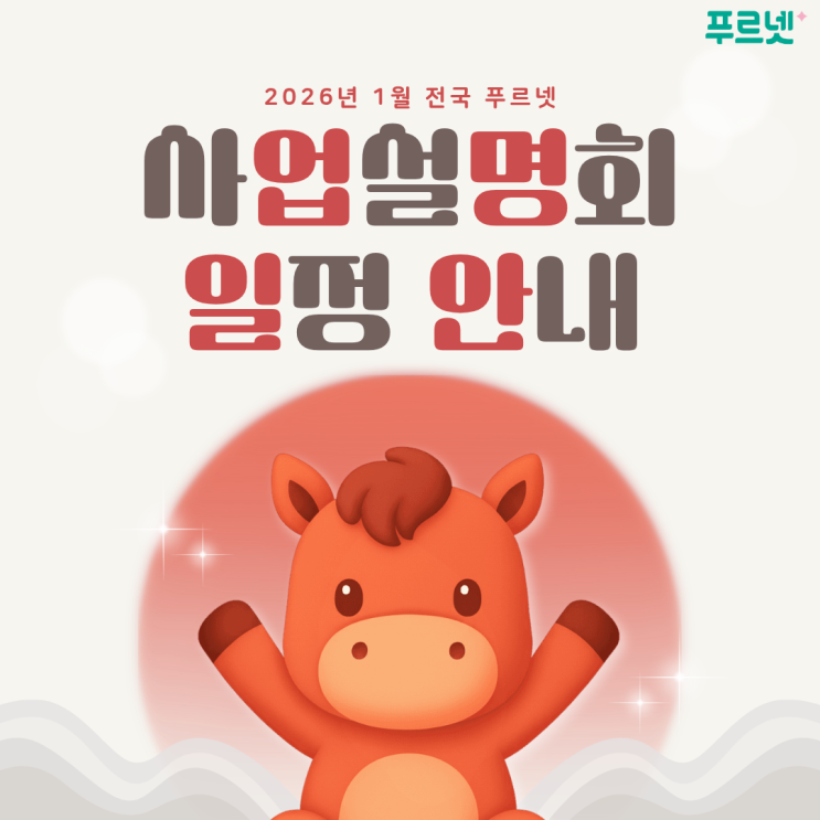 안녕하세요. 푸르넷입니다! 2026년 새해, 명문 장수 기업 금성출판사의 대표 공부방 브랜드 푸르넷에서 예비 교육 전문가를 모집합니다! 푸르넷 전국 사업설명회 2026년 1월 일정을 확인해 보세요! 대한민국 대표 교육 브랜드 푸르넷만의 성장 비결! 푸르넷 선생님들을 위한 편리한 시스템 제공! 교육에 집중하실 수 있도록 아낌없이 지원합니다! 대한민국 대표 교육 브랜드 푸르넷에서 2026년 새해에도 열정을 가지고 함께 달려갈 예비 교육 전문가를 기다립니다! 교육 분야별 선생님을 모집합니다! <모집 부문> 전국 푸르넷에서 예비 교육 전문가 분들을 위한 2026년 ✨1월 푸르넷 사업설명회✨가 열릴 예정입니다. 지점별 상세 일정은 아....... <img src="https://blogthumb.pstatic.net/MjAyNTEyMzFfNiAg/MDAxNzY3MTQ4Mjg3NjE5.epAYRJ_-PmhjkUgCIKCmwghpwEHpbCTnEYFnFwbVx-0g.RpWQY75QOBd9u4dDhSRGgyGzj4rUJXkMlvswNVWD85cg.PNG/1.png?type=s3" />