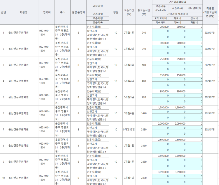 학원 금액 공지
