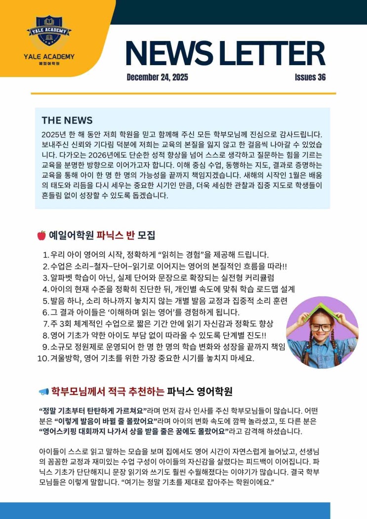 안녕하세요. 어느덧 한 해의 끝자락인 12월이 지나가고, 새로운 시작인 2026년도 1월이 다가오고 있습니다. 올 한 해 동안 키가 무럭무럭 자라는 학생들처럼, 실력과 인성면에서도 향상되는 아이들을 볼 때, 지난 한 해 동안 흘린 작은 땀과 노력 하나하나가 모여 큰 성장을 이루었음을 확신할 수 있었습니다. 그 과정을 가장 가까이에서 함께할 수 있어 진심으로 감사한 마음뿐입니다. 이제 다가오는 1월에는 새로운 목표를 세우고, 새로운 마음으로 다시 출발하는 시간이 될 것이라 믿습니다. 아이들이 영어를 통해 더 넓은 세상을 만나고, 스스로를 믿으며 도전할 수 있도록 저희가 든든한 동행자가 되겠습니다. 새해에도 변함없는 신뢰와 응....... <img src="https://blogthumb.pstatic.net/MjAyNTEyMjVfMTYg/MDAxNzY2NjM0MDk2OTA2.ZsVZ0fVJKs26eoPUXAR7UYDHSiw2i5oT3-sTqX6MHRMg.4wUHRBGSwoo8ouJnQa1YLgDksK2NO_K3DB72BOhHO2kg.JPEG/1.jpg?type=s3" />