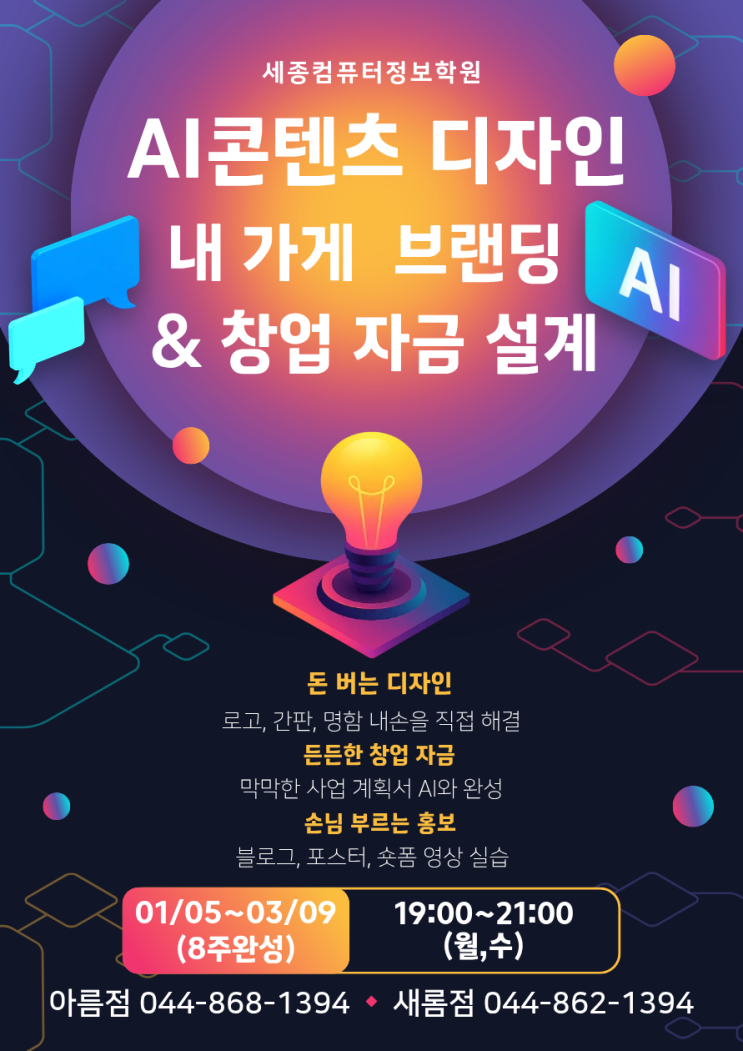 안녕하세요~ 세종시 IT전문 교육기관 세종컴퓨터정보학원입니다^^ 정년퇴직 후 제 2의 인생을 꿈꾸며 창업을 준비하고 계신가요? 나만의 가게를 갖고 싶지만, 복잡한 서류 작업과 비싼 디자인 비용, 그리고 어렵게만 느껴지는 컴퓨터 활용 때문에 망설이고 계셨다면 주목해 주세요! 20년 경력의 디자이너이자 정부지원사업 합격 컨설턴트인 함원호 강사가 여러분의 든든한 조력자가 되어드립니다. AI콘텐츠 디자인 Class에서 AI비서를 채용하고, 실패없는 창업을 시작해 보세요! 정년 퇴직후 오프라인 매장이나 지식 창업을 준비하시는분 컴퓨터 활용이 서툴러 문서 작성과 디자인이 두려우신 분 정부지원금을 받고 싶지만 사업계획서 작성이 막....... <img src="https://blogthumb.pstatic.net/MjAyNTEyMjZfMjIz/MDAxNzY2NzEzNTE3MTkx.efZjUECUdJ7eVQvidgiDCHsNI8RmxoP8jF83qzrHumUg.zvUUhDP7dhRJ54f3K79ptMBHyWhpbdqDLa1BMwtWkkQg.PNG/AI%C4%DC%C5%D9%C3%F7_%281%29.png?type=s3" />