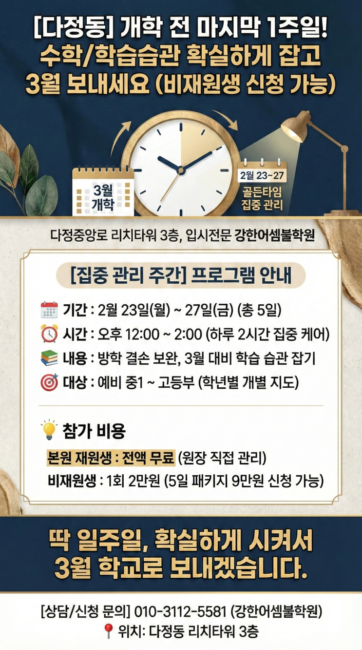 제목: 안녕하세요, 강한어셈블학원입니다. 2월 23일부터 27일, 개학 직전 5일간 [집중 관리 주간]을 운영합니다. 방학 동안 생긴 학습 공백, 지금 메우지 않으면 1학기 내내 고생합니다. 오후 12시부터 2시까지, 하루 2시간씩 집중 케어하여 '학습하는 자세'를 만들겠습니다. ✔ 기간: 2/23(월) ~ 2/27(금) ✔ 대상: 예비 중1 ~ 고등부 ✔ 비용: 재원생 무료 / 비재원생 1회 2만원 (5일 패키지 9만원) 우리 아이가 개학 날, 자신감 있게 등교하길 원하신다면 저를 믿고 보내주세요. 리치타워 3층, 불 켜져 있습니다. <img src="https://blogthumb.pstatic.net/MjAyNjAyMTNfMTEw/MDAxNzcwOTU2MjYwMjM5.yPVerF8WCgVL0b0V1-vXC0smxMi-M-8sXYHBkEQ3CJQg.08yn9OuxNgCAxknGQEoA_9kIyzz-CxrYiVKC64NoBQ4g.PNG/Gemini_Generated_Image_th067cth067cth06.png?type=s3" />