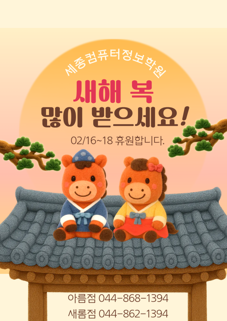 안녕하세요~ 세종시 IT전문교육기관 세종컴퓨터정보학원입니다^^ 내일부터 설연휴가 시작됩니다. 가족과 즐거운 연휴보내시고, 새해 복 많이 받으세요~ 2/16(월)~18(수)일은 휴원하오며, 19(목) 정상운영합니다^^ 새해에는 다들 '갓생' 살기 계획 하나쯤은 세우셨죠? 운동, 독서도 좋지만 내 몸값을 가장 확실하게 올리는 방법은 역시 '컴퓨터 실력'이 아닐까 싶습니다. 컴퓨터가 막막한 초등학생부터, 업무 효율이 절실한 직장인까지! 세종컴퓨터정보학원이 여러분의 든든한 날개가 되어드리겠습니다. 단순히 자격증만 따는 곳이 아닌, 실제로 쓸 수 있는 능력을 만들어 드립니다. PPT, 한글, 엑셀 기초 기능 사용 및 자격....... <img src="https://blogthumb.pstatic.net/MjAyNjAyMTNfMTMw/MDAxNzcwOTU4MzkxNzk2.Z2FzsKgpAANdpjX2s0h1Ky__ZQknhXfEmiPWONuv86Mg.2B2X-OOwipZcLmCzXZ2moPG_19ir30dAEpe1oBaB9sUg.PNG/%BC%B3%B3%AF.png?type=s3" />