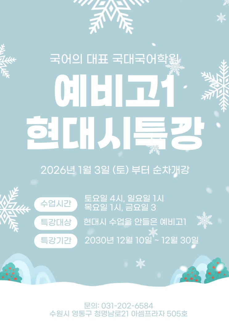 국대국어학원입니다. 오늘은 1월에 진행될 예비고1 현대시 특강에 대한 안내를 드리려고 왔어요^^ 7월에 진행되었던 첫 번째 파트 현대시를 수강 못 한 예비고1 친구들 현대시의 기본을 탄탄하게 잡아가고 싶은 예비고1 친구들을 위한 특강입니다. 마음이 바빠지는 시기인 예비고1 겨울방학 국대국어학원이 든든한 조력자가 되겠습니다. 특강신청은 링크로 해주세요^^ http://kukdae6584.com/new_prog/briefing_view.aspx?menu_idx=13150&Hd_B_IDX=3276 <img src="https://blogthumb.pstatic.net/MjAyNTEyMzBfMTEy/MDAxNzY3MDU0MzUyNzk3.cfUP2zRzO6dmt4Df4byev3TxkZ4eGdypSx4nErcqpYEg.9Y9AMwJhmBUFlToUT-ElMTFwwHXnAU37vdqJhHxng8Mg.JPEG/%C7%F6%B4%EB%BD%C3_%C6%AF%B0%AD.jpg?type=s3" />