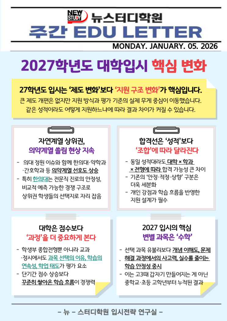 [망포동 뉴스터디 학원] 1월 6일: 2027학년도 대학입시의 핵심 변화는?