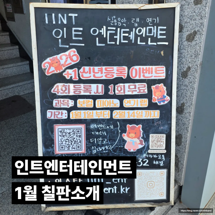 안녕하세요 영통미디작곡학원 인트엔터테인먼트 입니다! 학원 앞을 지나가다 보면 가장 먼저 눈에 들어오는 게 바로 영통미디작곡학원 인트엔터테인먼트 칠판인데요. 2026년 새해를 맞아 1월 칠판도 새롭게 꾸며보았습니다 2026 +1 신년 등록 이벤트 1월 칠판의 내용은 바로 신년 등록 +1 이벤트 입니다. ✔️ 4회(한 달) 수강 시 1회 무료 ✔️ 총 5회 수업 진행 ✔️ 신년 한정 혜택 새해를 맞아 보컬, 피아노, 연기, 랩 수업을 부담 없이 시작해볼 수 있도록 준비한 이벤트예요. 적용 과목은? 이번 신년 등록 이벤트는 아래 과목 모두 동일하게 적용됩니다. 보컬 피아노 연기 랩 “어떤 과목이 나에게 맞을지 아직 잘 모르겠어....... <img src="https://blogthumb.pstatic.net/MjAyNjAxMTFfNjgg/MDAxNzY4MTE4OTUwOTYz.3HD2oY9563B62uIcWsGK57vSAbDGeNjHlozYhQdNJY0g.ZOkXr_h3DdZyWT1ghIBfH6ld8Q89SJ966HLL9J4rnB0g.PNG/%C1%A6%B8%F1%C0%BB_%C0%D4%B7%C2%C7%D8%C1%D6%BC%BC%BF%E4._%282%29.png?type=s3" />