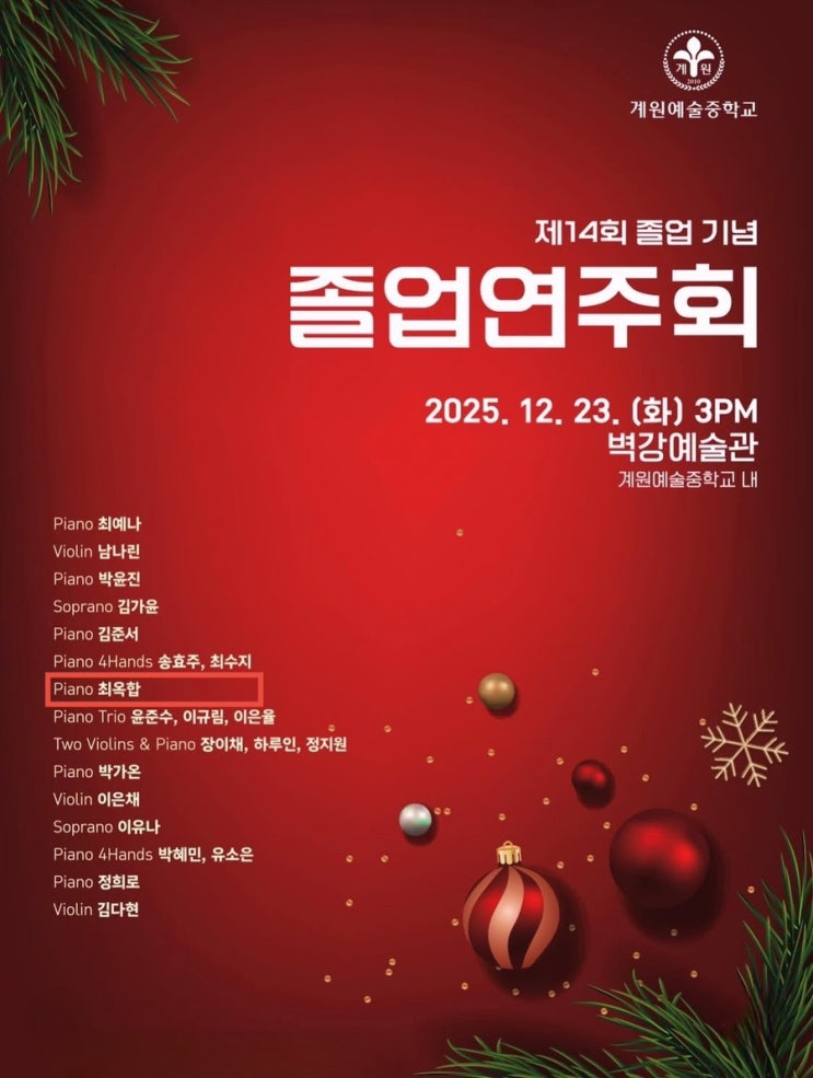 계원예술중학교 제14회 졸업연주회 일시: 2025년 12월 23일 (화) 시간: 15:00 장소: 벽강예술관 긴 입시를 마친 직후, 쉬어갈 법한 시간에도 멈추지 않고 한 달 만에 새 곡으로 졸업연주회 오디션에 도전해 합격이라는 결과로 무대에 서게 된 옥합이의 연주를 축하합니다. 상담문의: 031-702-0990 <img src="https://blogthumb.pstatic.net/MjAyNTEyMjJfMjg2/MDAxNzY2NDAzMDUzMjA4.XlUxVqqNvnUpGoCnX6cqCoOiThCLNV02Digp5eFLQZMg.e1Kt8gxamid2QDQ_FUcrmlVgsijnf65ujG9tzw3v5Ccg.JPEG/IMG%A3%DF2730.JPG?type=s3" />