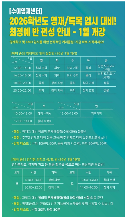 2026학년도 영재/특목 입시 대비! 최정예 반 편성 안내 영재학교 및 KMO 입시를 위한 전략적인 커리큘럼! 지금 바로 시작하세요! ◆ [예비 중3] 영재학교 대비 실전반 (26년 1월 개강) - 핵심 : 영재고 대비 창의적 문제해결력(수학/과학) 집중반 - 특징 : 주7일 영재고 대비 집중 교육/매주 영재고 대비 실전모의고사 실시. - 입학 테스트 : 수학(10문항, 60분, 중등 창의 사고력), 과학(30문항, 60분) ◆ [예비 중3] 경기형 과학고 금/토 반 (26년 1월 개강) “경기북과고, 경기형 과고 등 최종 합격을 목표로 하는 최상위권 특별반!” - 핵심 : 과학고 대비 창의적 문제해결력(창의 과학/창의 수학)집중 훈련. - 특징 : 평일(금)또는 주말(토....... <img src="https://blogthumb.pstatic.net/MjAyNTEyMjNfMTQy/MDAxNzY2NDc5Nzg5ODg5.t03YpF8uK1f3ncy_TEvByNjVdMKlqI_DDbBhtxFMug0g.sPbkNWga7lh9qqk4YsyQJx04sZ7fUFNa0Ot4UJoY2iQg.PNG/1.png?type=s3" />