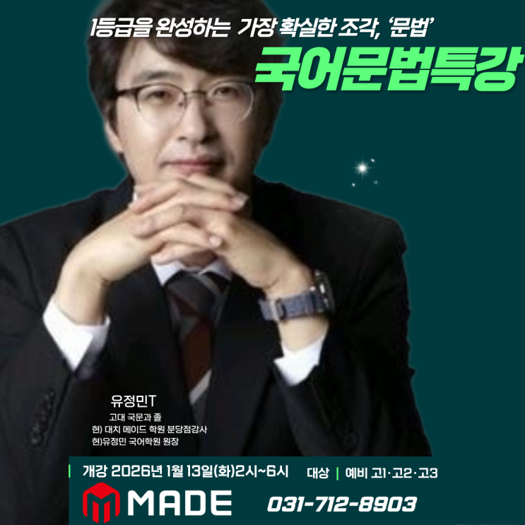 분당고등국어학원 유정민 T 문법 겨울방학 특강 “지문은 길었고, 시간은 부족했으며, 국어가 더 어려워졌다.” 2026학년도 수능 국어는 표준점수 최고점 147점을 기록하며, 국어 영역의 난도와 변별력이 한층 강화되었음을 보여 주었습니다. 많은 수험생들이 공통적으로 느낀 어려움은 단순한 문제의 난도가 아니라, 길어진 지문과 극심한 시간 압박이었습니다. 킬러 문항이 사라진 자리에는 독서 영역 전반에 걸친 높은 정보 밀도와 복합적 사고를 요구하는 문항들이 배치되었고, 이로 인해 상위권과 중위권의 격차는 오히려 더 분명해졌습니다. 이러한 구조 속에서 국어 성적을 좌우하는 핵심은 더 많이 아는 것이 아니라, 얼마나 빠르고 정확....... <img src="https://blogthumb.pstatic.net/MjAyNTEyMjZfMzUg/MDAxNzY2NzIyMjMxNDgy.uER175VjnxZMmCHHv_949zc3UQFT0eXc9uzClJlcKxYg.9fGhv9nUfIfndB-EIB4oLx6tSX0I4AVEthEEETw5JoUg.PNG/%C0%AF%C1%A4%B9%CET.png?type=s3" />