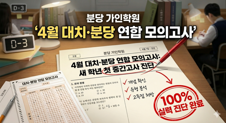 안녕하세요. 수학 성적이 아름다워지는 공간, 분당 가인학원입니다! 새 학년 첫 시험 전, 학생의 객관적인 위치를 정밀하게 파악할 4월 대치·분당 연합 모의고사 진단을 실시합니다. 대치 가인과 동일한 학년 학생들이 함께 치르는 통합 테스트로, 객관적인 실력 검증은 물론 실전과 동일한 긴장감 속에서 자신의 취약점을 파악할 수 있는 기회입니다. [D-3] 이번주 토요일(4월 4일)부터 1학기 중간고사 정밀 진단이 시작됩니다! ✅시험 기간 2026년 4월 4일(토) ~ 4월 11일(토) ✅응시 대상 중학생(예비 중1 포함) 및 고등학교 1, 2학년 재원생 ※ 중1 학생들은 중등 수학의 첫 단추를 잘 끼웠는지 확인할 수 있는 현행 완성도 진단의 기회입니....... <img src="https://blogthumb.pstatic.net/MjAyNjA0MDFfODIg/MDAxNzc1MDM4MTU3MTk3.OcVCCapmvVN-FVFBcTbBInUYJsKRI_VOeZgkOLZlRx8g.H2M3UhD3tYdkY40VXR_AMyjGr_956obWLgfKDBwcPl0g.PNG/1.png?type=s3" />