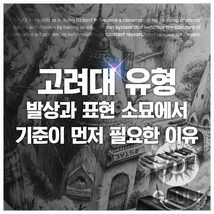 평촌미술학원 가우디 고려대유형 발상과 표현 소묘에서 기준이 먼저 필요한 이유 미대입시를 준비하다 보면 ‘고려대유형 발상과 표현’이라는 말이 막연하게 느껴지는 경우가 많습니다. 정해진 답이 없다는 점 때문에 아이디어를 많이 내야 하는 그림으로 오해되기도 합니다. 하지만 평촌미술학원 가우디에서 바라보는 고려대유형 발상과 표현 소묘는 무작위적인 아이디어 나열이 아닙니다. 어떤 기준을 가지고 발상을 구조화했는지가 가장 중요하게 평가되는 유형입니다. 연필과 피아노 건반이라는 제시물을 바탕으로 고려대유형 발상과 표현을 전개한 이 연구작은 아이디어의 개수를 늘리기보다, 하나의 발상을 끝까지 설득력 있게 밀어붙이는....... <img src="https://blogthumb.pstatic.net/MjAyNjAxMTJfMTM4/MDAxNzY4MjAwMzYzODc4.nVj4iDDvFXsF0PxP12WJSYAe-TQv84mBZQvdnMhjYWYg.KNVr1kDrQMigNHS6XNxWGbEXbOu3KvjqiLZq6o3F1RAg.JPEG/%B0%ED%B7%C1%B4%EB-%C0%AF%C7%FC.jpg?type=s3" />