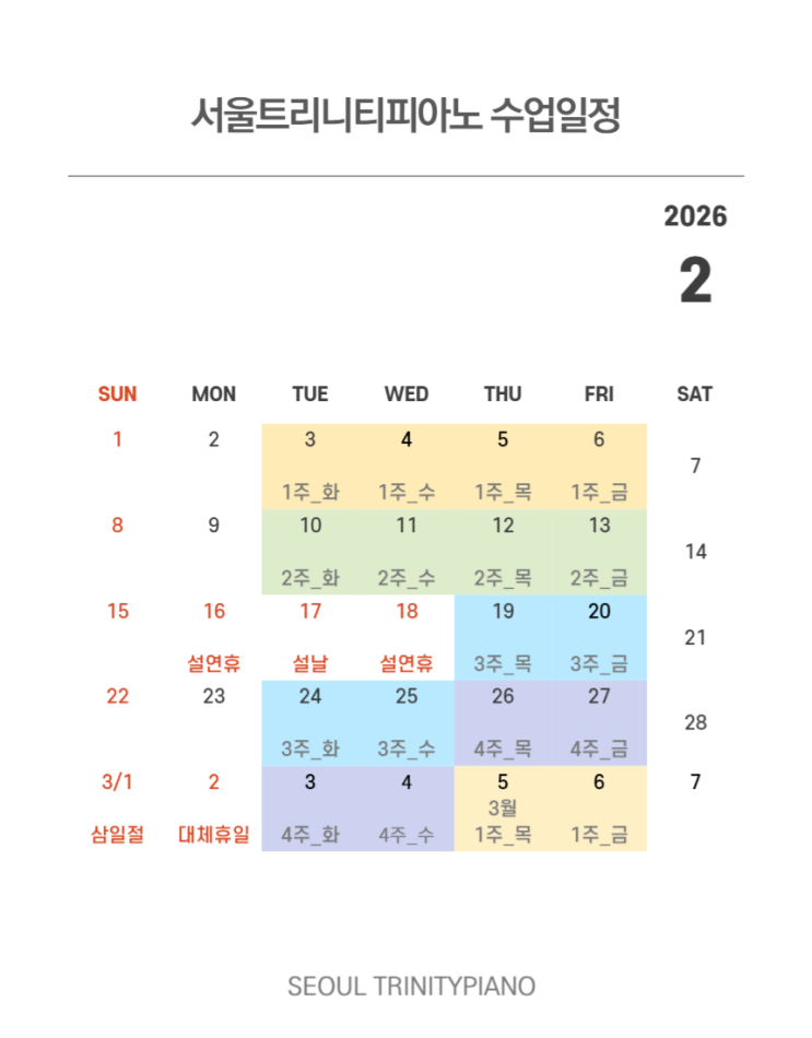 안녕하세요? 서울트리니티피아노 소식 알려드립니다:) #1. 수업일정 2월 수업은 2/3(화)~3/4(수)입니다. 첨부해드리는 캘린더 참고해주세요~ #2. 설연휴 휴원 안내 2월 16일~18일 설연휴 휴원입니다. 가족들과 즐거운 명절 보내세요^^ #3. 수업스케줄 관련 안내 서울트리니티피아노 수업스케줄은 학교학기 중, 방학 중 변동없이 동일합니다. 스케줄 변경을 원하시는 경우 톡으로 개별 문의주세요~ 각 가정 휴가 일정 등으로 연속 일주일 이상 수업이 어려울 경우, 미리 말씀해주시면 교습비를 조정해서 등록하실 수 있습니다. #4. 2월 등록 기존수강생 등록 : 교습비 납부일은 전월 20일~25일까지입니다. 카드결제, 안양사랑페이, 계좌이체, 현금....... <img src="https://blogthumb.pstatic.net/MjAyNjAyMDNfODkg/MDAxNzcwMDk5MTMxMjEw.FdXEdLr_A7MH4EJo-yIDP1T2VRuRShfhhBCEKi0kfkkg.NDl4EDD6TjVLT7quFRVJdBrU7zlcuDdsXjXwpCG_kJEg.PNG/1770098854225.png?type=s3" />